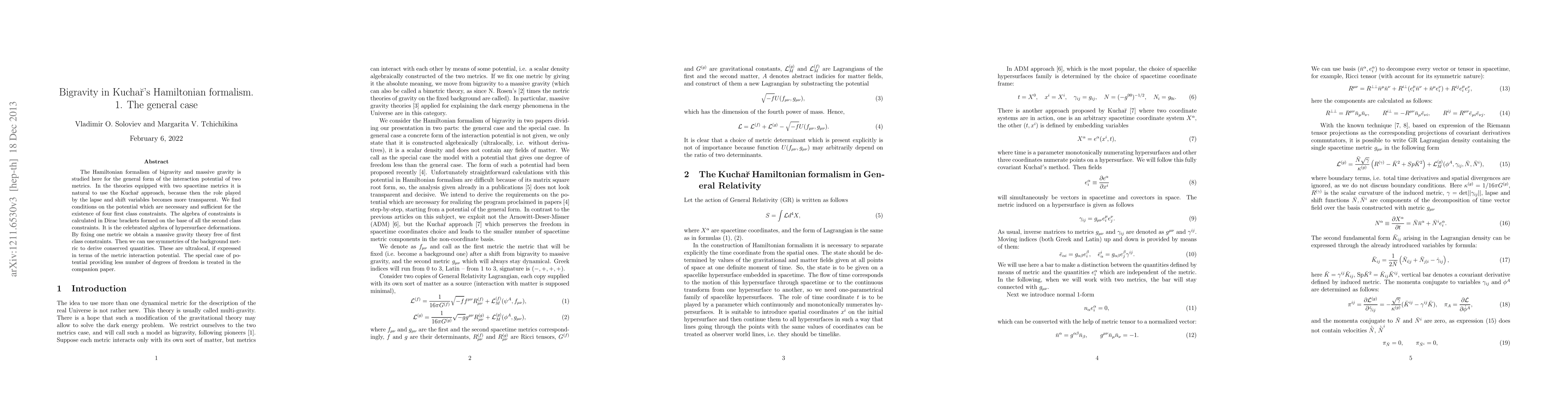 The Hamiltonian formalism of bigravity and massive gravity is studied here for the general form of the interaction potential of two metrics. In the theories equipped with two spacetime metrics it is natural to use the Kuchar approach, because then the role played by the lapse and shift variables becomes more transparent. We find conditions on the potential which are necessary and sufficient for the existence of four first class constraints. The algebra of constraints is calculated in Dirac brackets formed on the base of all the second class constraints. It is the celebrated algebra of hypersurface deformations. By fixing one metric we obtain a massive gravity theory free of first class constraints. Then we can use symmetries of the background metric to derive conserved quantities. These are ultralocal, if expressed in terms of the metric interaction potential. The special case of potential providing less number of degrees of freedom is treated in the companion paper.
