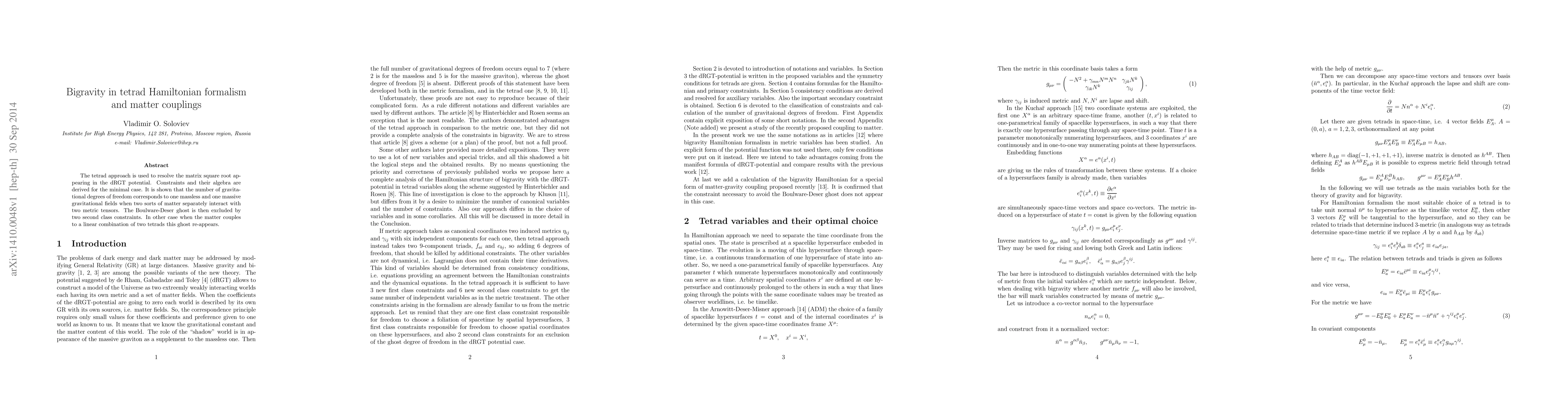 The tetrad approach is used to resolve the matrix square root appearing in the dRGT potential. Constraints and their algebra are derived for the minimal case. It is shown that the number of gravitational degrees of freedom corresponds to one massless and one massive gravitational fields when two sorts of matter separately interact with two metric tensors. The Boulware-Deser ghost is then excluded by two second class constraints. In other case when the matter couples to a linear combination of two tetrads this ghost re-appears.
