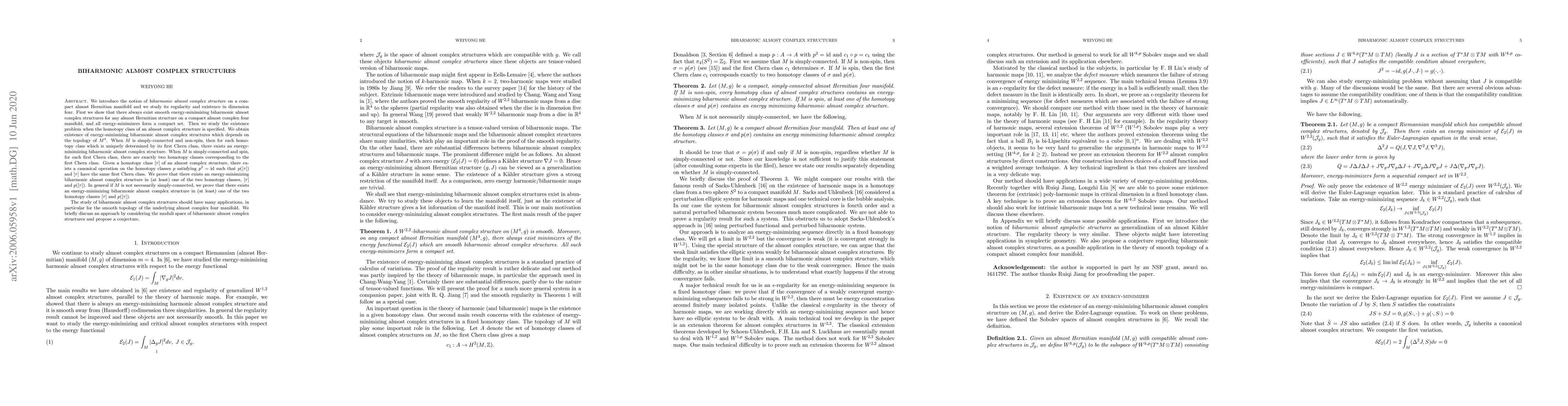 This paper introduces the concept of biharmonic almost complex structures on compact almost Hermitian four-manifolds, proving their existence and regularity. It demonstrates that for any almost Hermitian structure, smooth energy-minimizing biharmonic almost complex structures exist, and establishes conditions for their existence based on the manifold's topology, particularly focusing on simply-connected and spin manifolds.