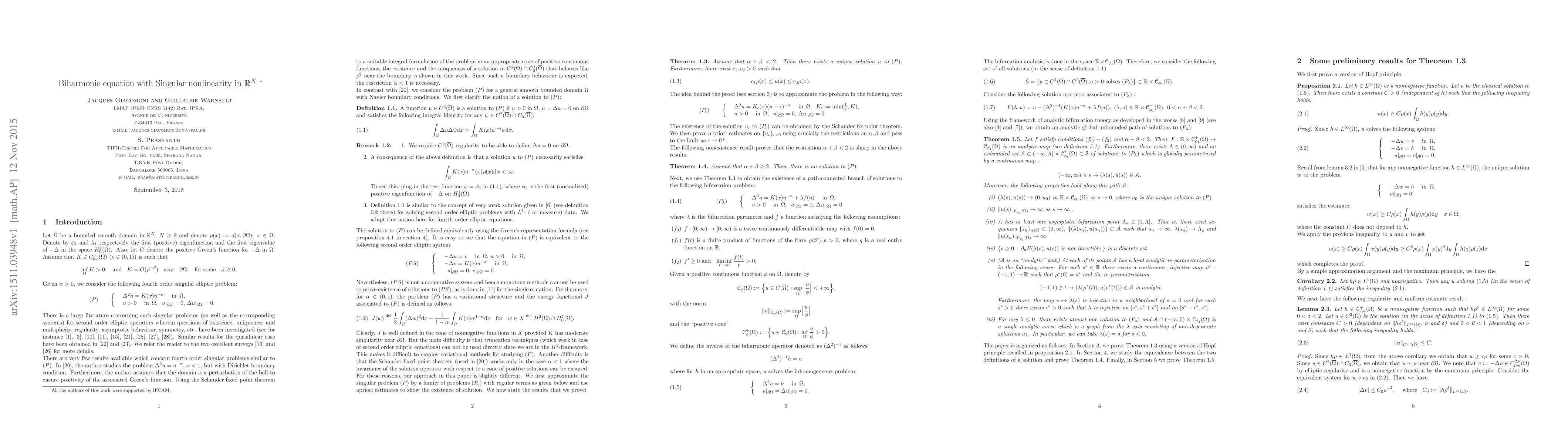 We consider the following problem: \begin{eqnarray*} ( P)\qquad \displaystyle\left\{\begin{array} {ll} & \Delta^2 u = K(x)u^{-\alpha} \quad \mbox{ in }\,\Omega , \\ &u> 0\quad \mbox{ in }\,\Omega, \;\;u\vert_{\partial\Omega}=0, \,\Delta u\vert_{\partial\Omega} = 0. \end{array}\right. \end{eqnarray*} We prove the main existence result: Assume that $\alpha+\beta<2$. Then there exists a unique solution $u$ to $(P)$. Furthermore, there exist $c_1, c_2>0$ such that \begin{eqnarray}\label{behaviour-bound} c_1 \rho(x)\leq u(x)\leq c_2 \rho(x) \end{eqnarray} where $\rho(x)=d(x,\partial\Omega)$. This result is sharp: Assume that $\alpha+\beta\geq 2$. Then, there is no solution to $(P)$.