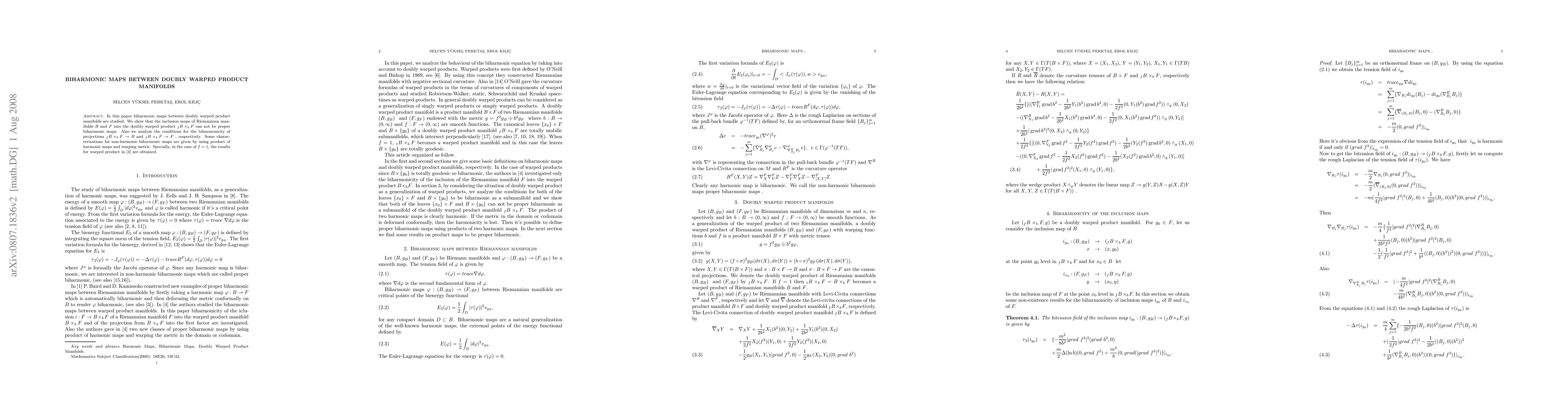 This paper investigates biharmonic maps between doubly warped product manifolds, demonstrating that inclusion maps of $B$ and $F$ into $_{f}B\times_{b}F$ cannot be proper biharmonic. It also examines conditions for the biharmonicity of projections from $_{f}B\times_{b}F$ to $B$ and $F$, and provides characterizations for non-harmonic biharmonic maps using harmonic maps and warping metrics.