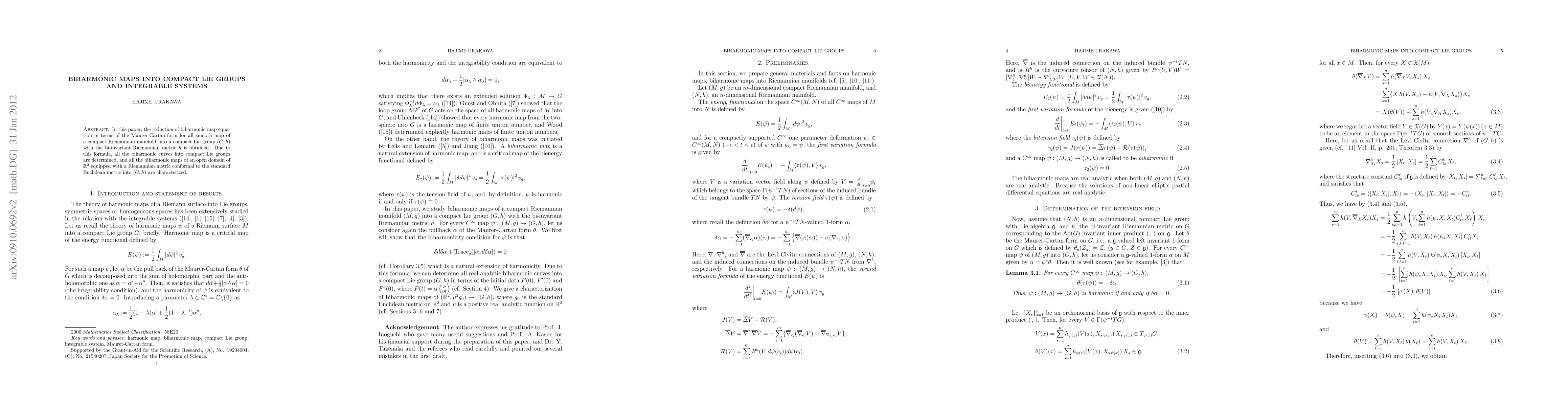 The paper derives a formula for biharmonic maps into compact Lie groups using the Maurer-Cartan form, which characterizes biharmonic curves and maps from 2-dimensional domains into these groups, linking them to integrable systems.