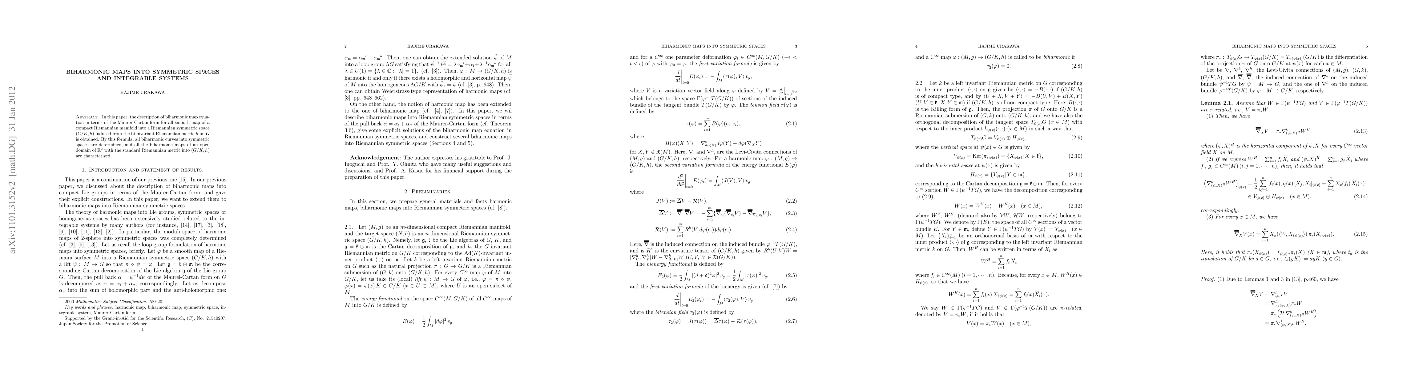 This paper derives the biharmonic map equation in terms of the Maurer-Cartan form for maps from compact Riemannian manifolds to symmetric spaces, determining biharmonic curves and maps from open domains in ${\Bbb R}^2$ to these symmetric spaces.