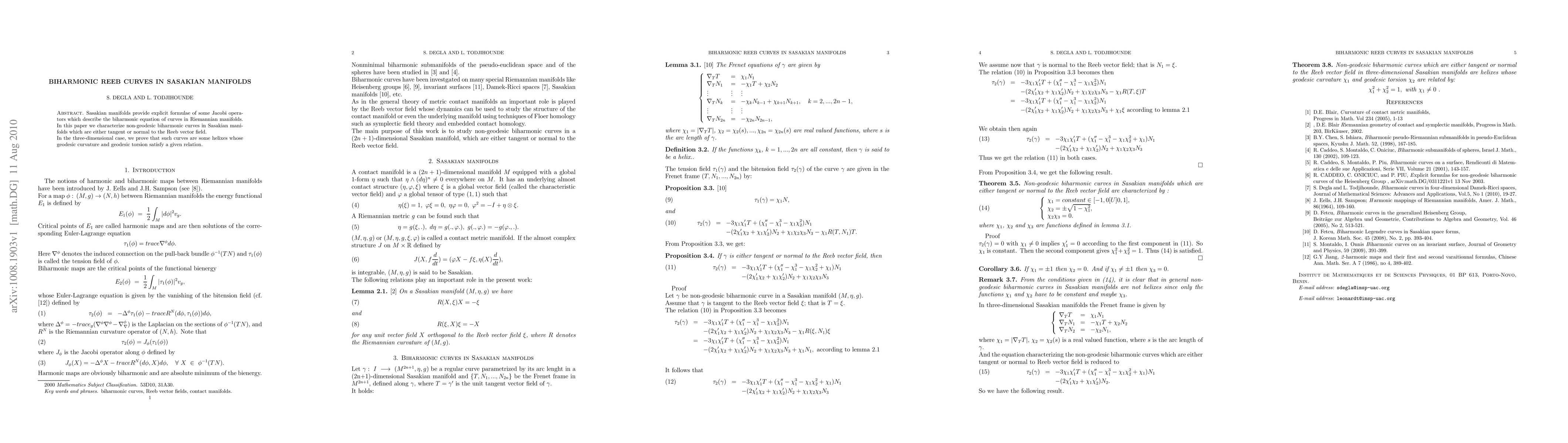 This paper characterizes non-geodesic biharmonic curves in Sasakian manifolds that are tangent or normal to the Reeb vector field, proving that in three dimensions, these curves are helices with specific geodesic curvature and torsion relations.