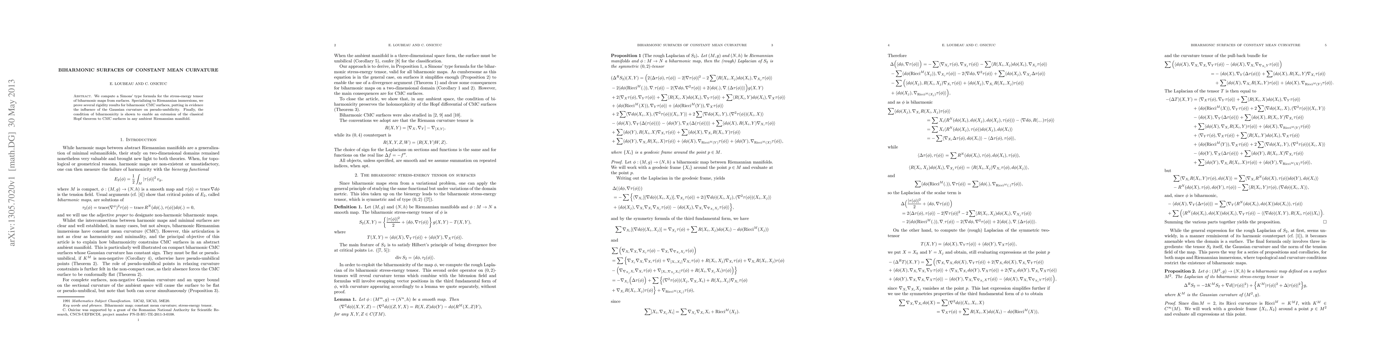 This paper derives a Simons' formula for biharmonic maps from surfaces and proves rigidity results for biharmonic surfaces of constant mean curvature (CMC), emphasizing the role of Gaussian curvature in pseudo-umbilicity. It also extends the classical Hopf theorem to CMC surfaces in any ambient Riemannian manifold via biharmonicity.