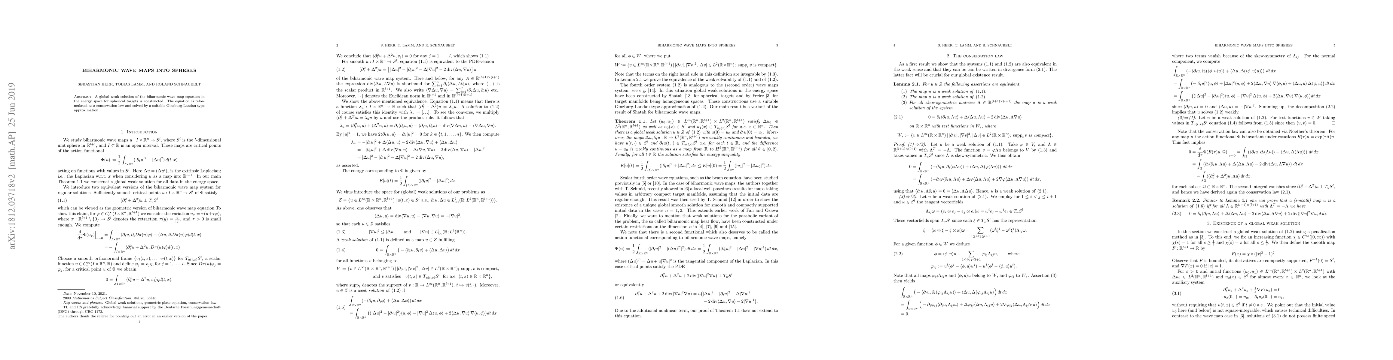 A global weak solution of the biharmonic wave map equation in the energy space for spherical targets is constructed. The equation is reformulated as a conservation law and solved by a suitable Ginzburg-Landau type approximation.
