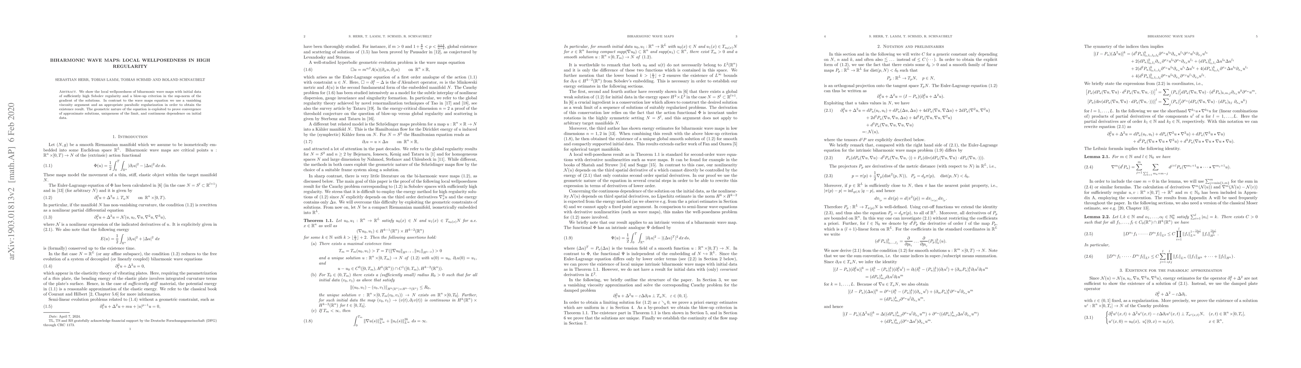 This paper establishes local wellposedness for biharmonic wave maps with high Sobolev regularity, employing a vanishing viscosity argument and parabolic regularization. The study also provides a blow-up criterion and proves convergence, uniqueness, and continuous dependence on initial data.