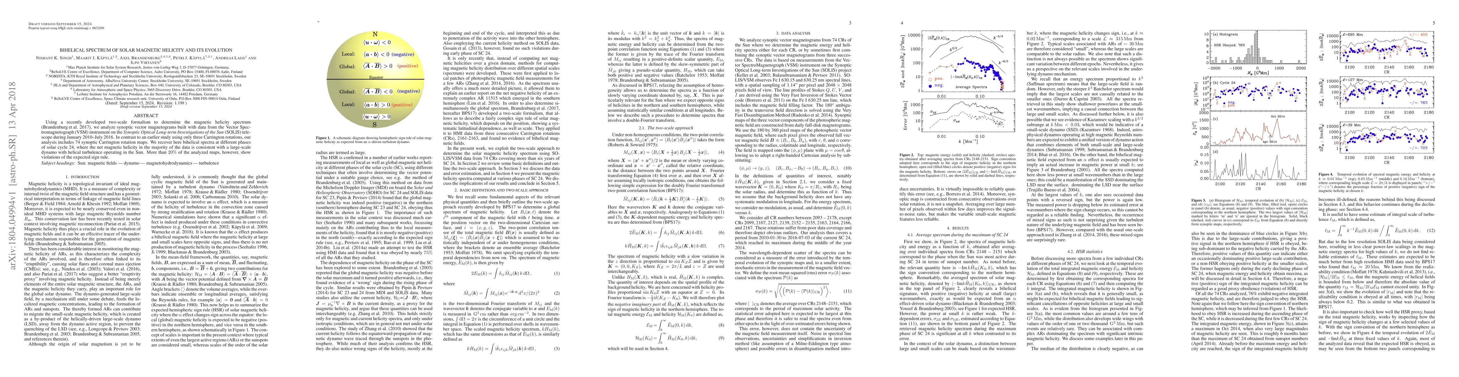 This study employs a two-scale formalism to analyze the magnetic helicity spectrum from solar vector magnetograms over a six-year period, revealing bihelical spectra consistent with a large-scale dynamo and helical turbulence. However, over 20% of the analyzed maps show deviations from the expected sign rule.