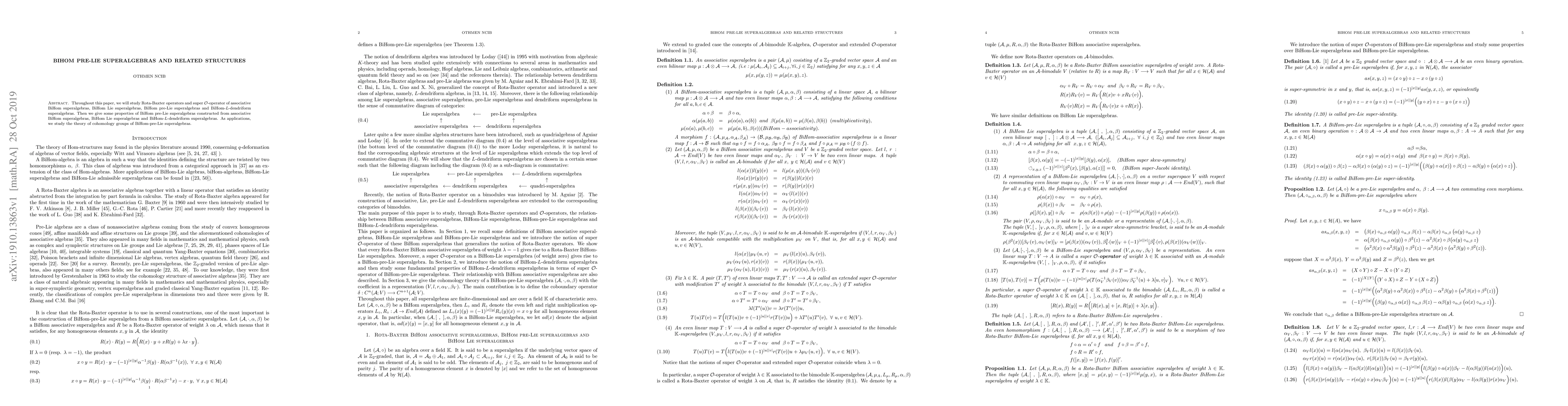 Throughout this paper, we will study Rota-Baxter operators and super O-operator of associative BiHom superalgebras, BiHom Lie superalgebras, BiHom pre-Lie superalgebras and BiHom-L-dendriform superalgebras. Then we give some properties of BiHom pre-Lie superalgebras constructed from associative BiHom superalgebras, BiHom Lie superalgebras and BiHom-L-dendriform superalgebras. As applications, we study the theory of cohomology groups of BiHom-pre-Lie superalgebras.