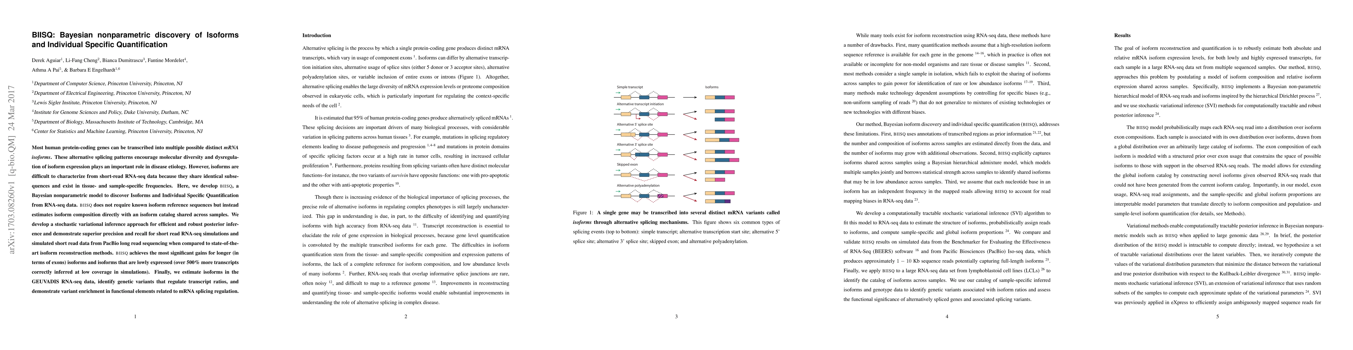 Most human protein-coding genes can be transcribed into multiple possible distinct mRNA isoforms. These alternative splicing patterns encourage molecular diversity and dysregulation of isoform expression plays an important role in disease etiology. However, isoforms are difficult to characterize from short-read RNA-seq data because they share identical subsequences and exist in tissue- and sample-specific frequencies. Here, we develop BIISQ, a Bayesian nonparametric model to discover Isoforms and Individual Specific Quantification from RNA-seq data. BIISQ does not require known isoform reference sequences but instead estimates isoform composition directly with an isoform catalog shared across samples. We develop a stochastic variational inference approach for efficient and robust posterior inference and demonstrate superior precision and recall for short read RNA-seq simulations and simulated short read data from PacBio long read sequencing when compared to state-of-the-art isoform reconstruction methods. BIISQ achieves the most significant gains for longer (in terms of exons) isoforms and isoforms that are lowly expressed (over 500% more transcripts correctly inferred at low coverage in simulations). Finally, we estimate isoforms in the GEUVADIS RNA-seq data, identify genetic variants that regulate transcript ratios, and demonstrate variant enrichment in functional elements related to mRNA splicing regulation.