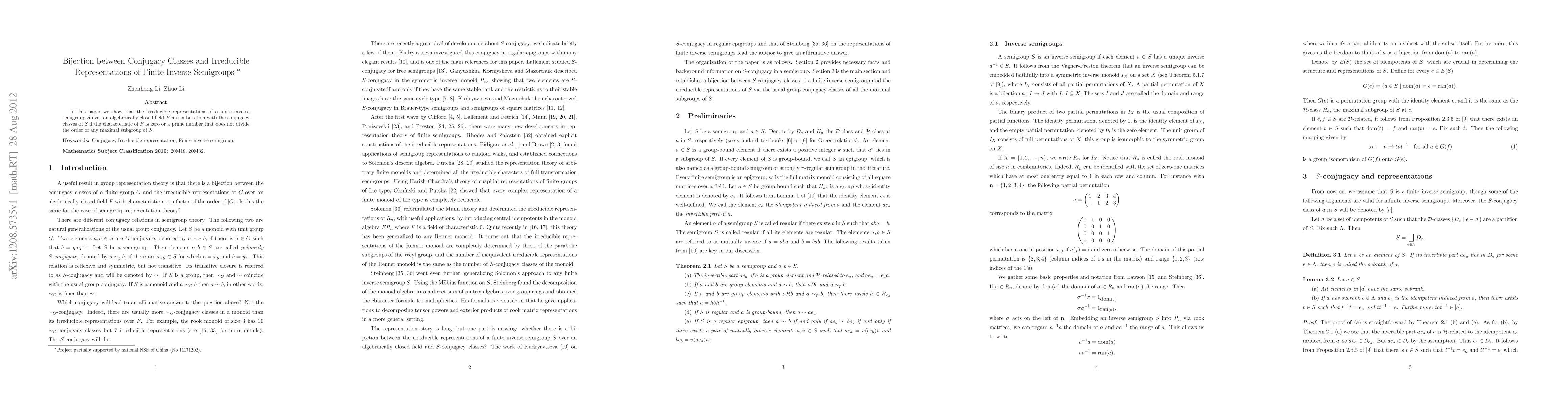 Summary: This paper establishes a bijection between the conjugacy classes and irreducible representations of finite inverse semigroups $S$ over an algebraically closed field $F$, provided the characteristic of $F$ is zero or a prime not dividing the order of any maximal subgroup of $S$.