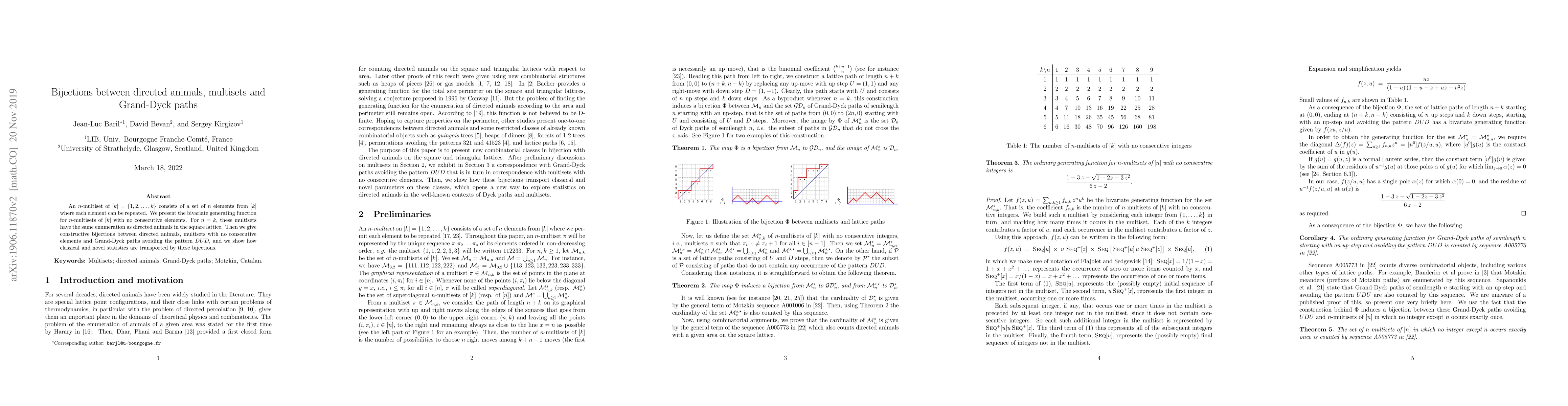This paper establishes bijections between $n$-multisets of $[k]$ with no consecutive elements, directed animals, and Grand-Dyck paths avoiding the pattern $DUD$, and presents their bivariate generating function. It also explores how classical and novel statistics are preserved through these bijections.