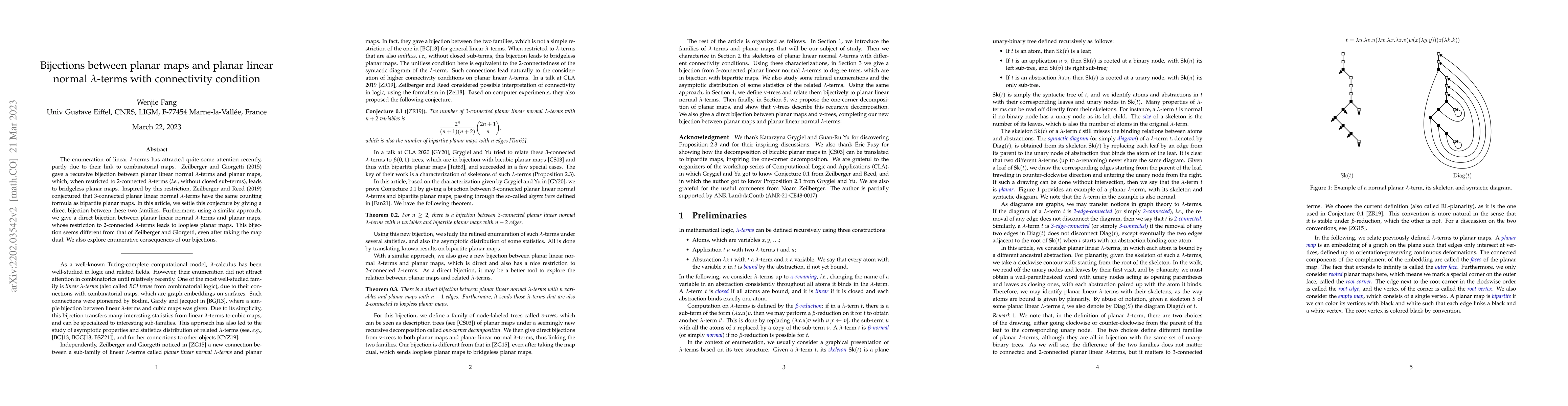 This paper establishes a direct bijection between 3-connected planar linear normal $\lambda$-terms and bipartite planar maps, resolving a conjecture from Zeilberger and Reed (2019). It also presents a new bijection between planar linear normal $\lambda$-terms and planar maps, distinct from Zeilberger and Giorgetti’s, and explores its enumerative implications.