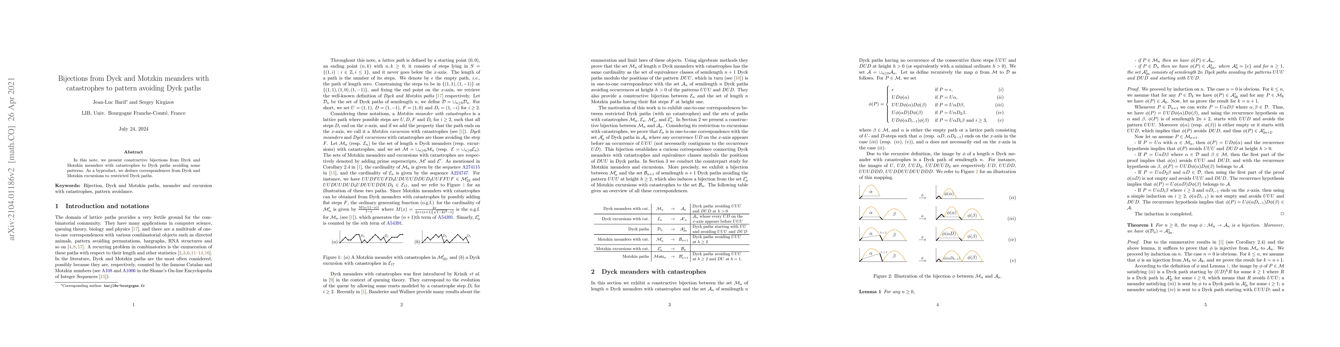This paper establishes constructive bijections from Dyck and Motzkin meanders with catastrophes to pattern-avoiding Dyck paths, also deriving correspondences from Dyck and Motzkin excursions to restricted Dyck paths.