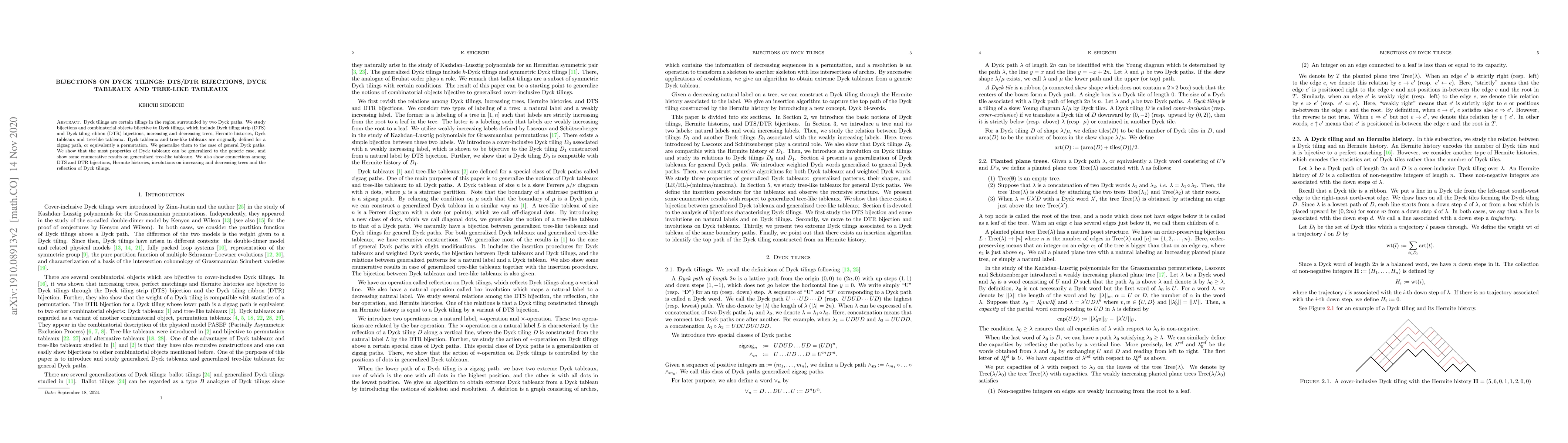 This paper studies combinatorial bijections between Dyck tilings and various combinatorial objects, including DTS and DTR bijections, Dyck tableaux, and tree-like tableaux, extending their definitions to general Dyck paths and enumerating generalized tree-like tableaux, while also exploring connections between these objects.