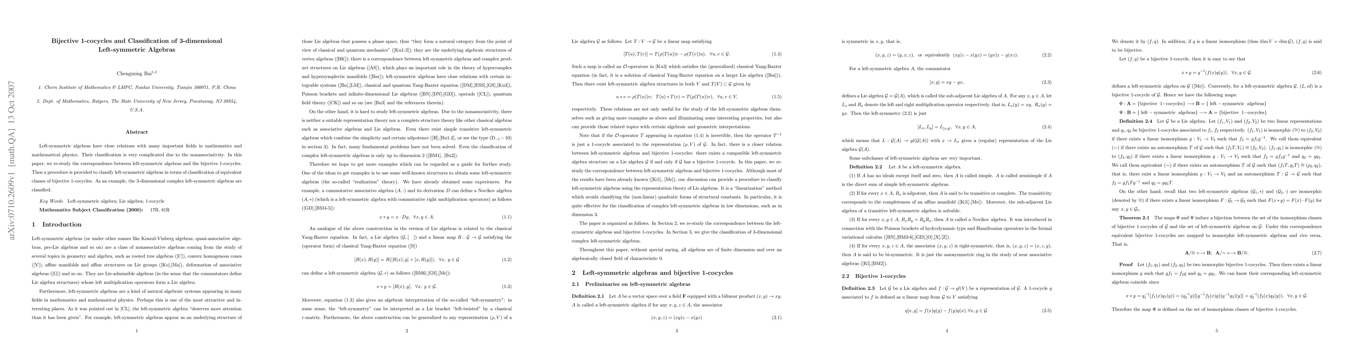 This paper studies the classification of 3-dimensional left-symmetric algebras using bijective 1-cocycles, providing a new approach to understand their complexity.