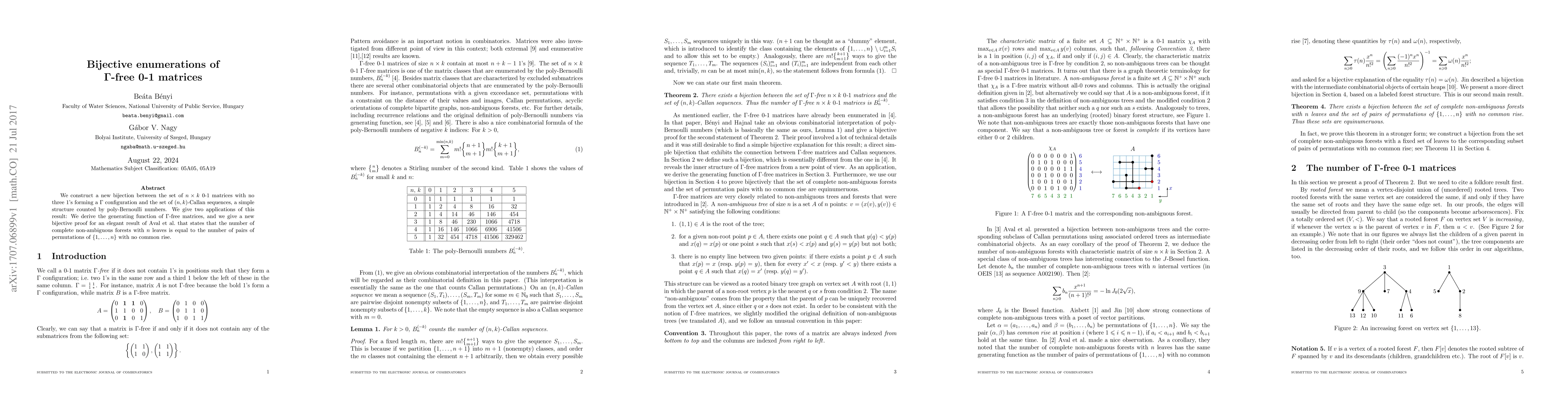We construct a new bijection between the set of $n\times k$ $0$-$1$ matrices with no three $1$'s forming a $\Gamma$ configuration and the set of $(n,k)$-Callan sequences, a simple structure counted by poly-Bernoulli numbers. We give two applications of this result: We derive the generating function of $\Gamma$-free matrices, and we give a new bijective proof for an elegant result of Aval et al. that states that the number of complete non-ambiguous forests with $n$ leaves is equal to the number of pairs of permutations of $\{1,\dots,n\}$ with no common rise.