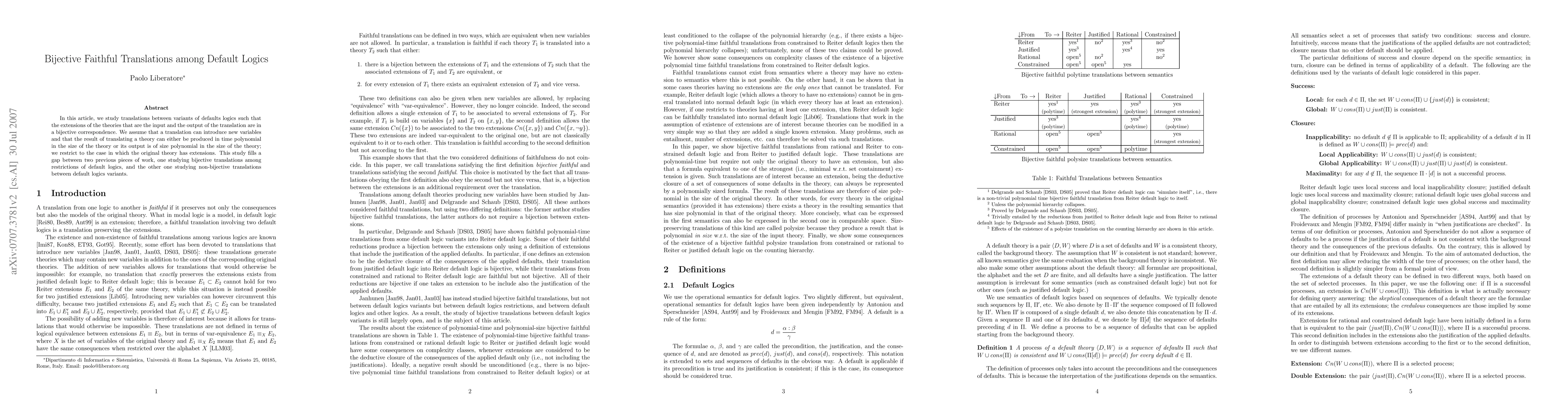 In this article, we study translations between variants of defaults logics such that the extensions of the theories that are the input and the output of the translation are in a bijective correspondence. We assume that a translation can introduce new variables and that the result of translating a theory can either be produced in time polynomial in the size of the theory or its output is polynomial in that size; we however restrict to the case in which the original theory has extensions. This study fills a gap between two previous pieces of work, one studying bijective translations among restrictions of default logics, and the other one studying non-bijective translations between default logics variants.