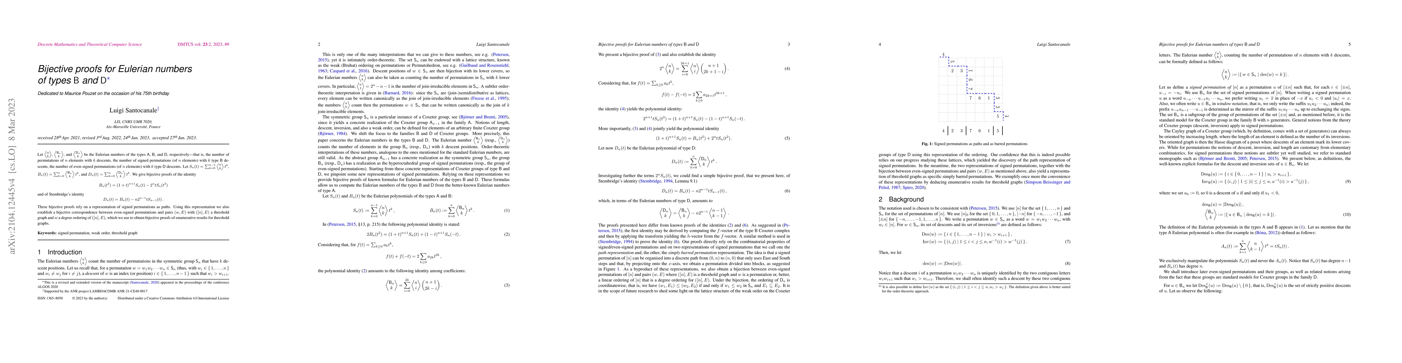 Let $\Bigl\langle\matrix{n\cr k}\Bigr\rangle$, $\Bigl\langle\matrix{B_n\cr k}\Bigr\rangle$, and $\Bigl\langle\matrix{D_n\cr k}\Bigr\rangle$ be the Eulerian numbers in the types A, B, and D, respectively -- that is, the number of permutations of n elements with $k$ descents, the number of signed permutations (of $n$ elements) with $k$ type B descents, the number of even signed permutations (of $n$ elements) with $k$ type D descents. Let $S_n(t) = \sum_{k = 0}^{n-1} \Bigl\langle\matrix{n\cr k}\Bigr\rangle t^k$, $B_n(t) = \sum_{k = 0}^n \Bigl\langle\matrix{B_n\cr k}\Bigr\rangle t^k$, and $D_n(t) = \sum_{k = 0}^n \Bigl\langle\matrix{D_n\cr k}\Bigr\rangle t^k$. We give bijective proofs of the identity $$B_n(t^2) = (1 + t)^{n+1}S_n(t) - 2^n tS_n(t^2)$$ and of Stembridge's identity $$D_n(t) = B_n(t) - n2^{n-1}tS_{n-1}(t).$$ These bijective proofs rely on a representation of signed permutations as paths. Using this representation we also establish a bijective correspondence between even signed permutations and pairs $(w, E)$ with $([n], E)$ a threshold graph and $w$ a degree ordering of $([n], E)$, which we use to obtain bijective proofs of enumerative results for threshold graphs.