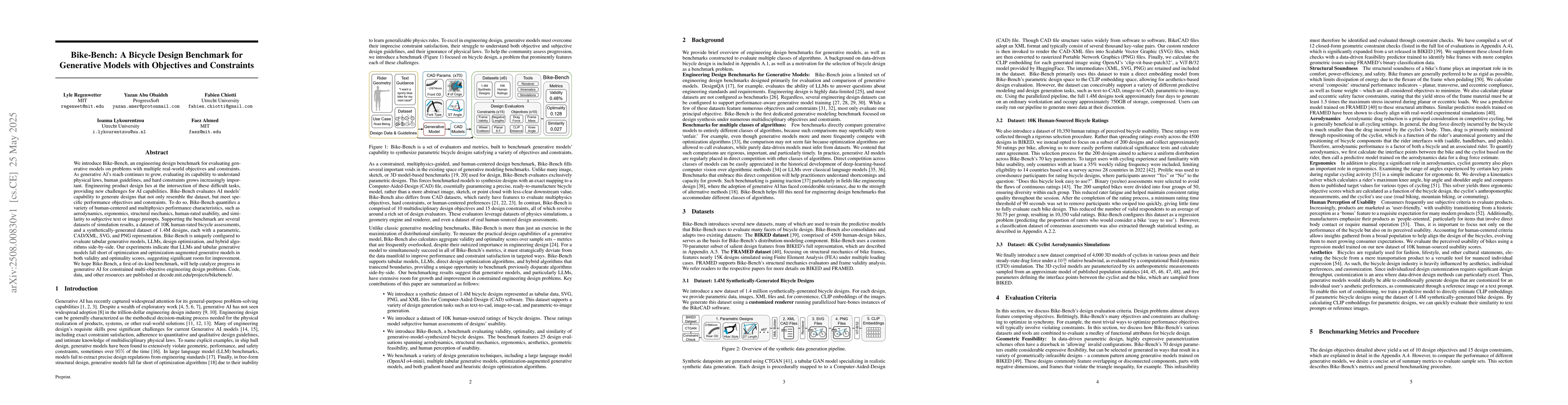 We introduce Bike-Bench, an engineering design benchmark for evaluating generative models on problems with multiple real-world objectives and constraints. As generative AI's reach continues to grow, evaluating its capability to understand physical laws, human guidelines, and hard constraints grows increasingly important. Engineering product design lies at the intersection of these difficult tasks, providing new challenges for AI capabilities. Bike-Bench evaluates AI models' capability to generate designs that not only resemble the dataset, but meet specific performance objectives and constraints. To do so, Bike-Bench quantifies a variety of human-centered and multiphysics performance characteristics, such as aerodynamics, ergonomics, structural mechanics, human-rated usability, and similarity to subjective text or image prompts. Supporting the benchmark are several datasets of simulation results, a dataset of 10K human-rated bicycle assessments, and a synthetically-generated dataset of 1.4M designs, each with a parametric, CAD/XML, SVG, and PNG representation. Bike-Bench is uniquely configured to evaluate tabular generative models, LLMs, design optimization, and hybrid algorithms side-by-side. Our experiments indicate that LLMs and tabular generative models fall short of optimization and optimization-augmented generative models in both validity and optimality scores, suggesting significant room for improvement. We hope Bike-Bench, a first-of-its-kind benchmark, will help catalyze progress in generative AI for constrained multi-objective engineering design problems. Code, data, and other resources are published at decode.mit.edu/projects/bikebench/.