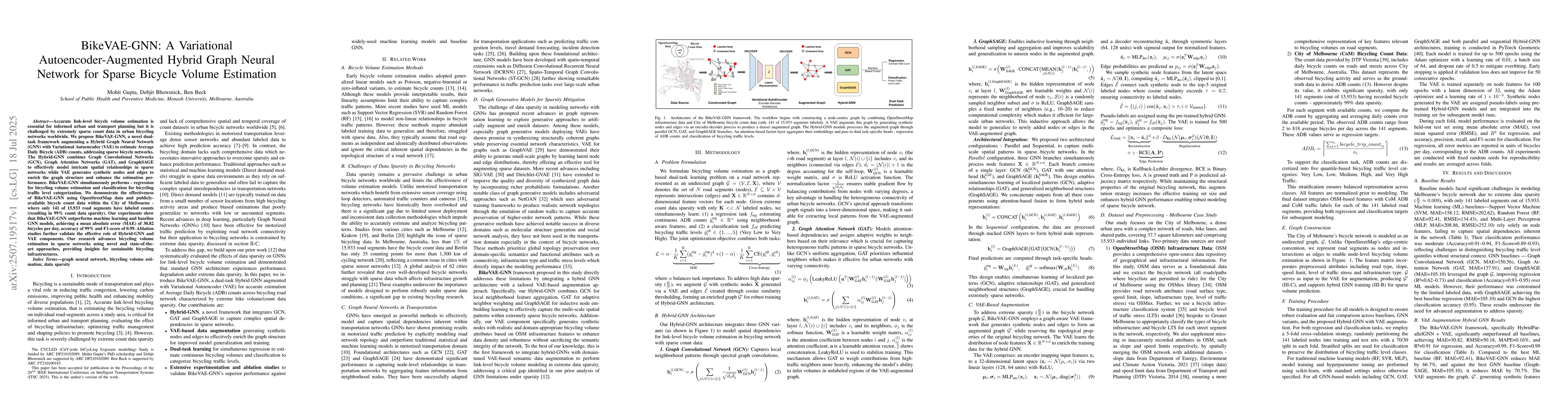 The research employs a dual-task learning approach, combining a Hybrid Graph Neural Network (GNN) with a Variational Autoencoder (VAE) to estimate Average Daily Bicycle (ADB) counts. The Hybrid-GNN integrates Graph Convolutional Networks (GCN), Graph Attention Networks (GAT), and GraphSAGE to model complex spatial relationships in sparse networks. The VAE generates synthetic nodes and edges to enrich the graph structure, enhancing estimation performance.