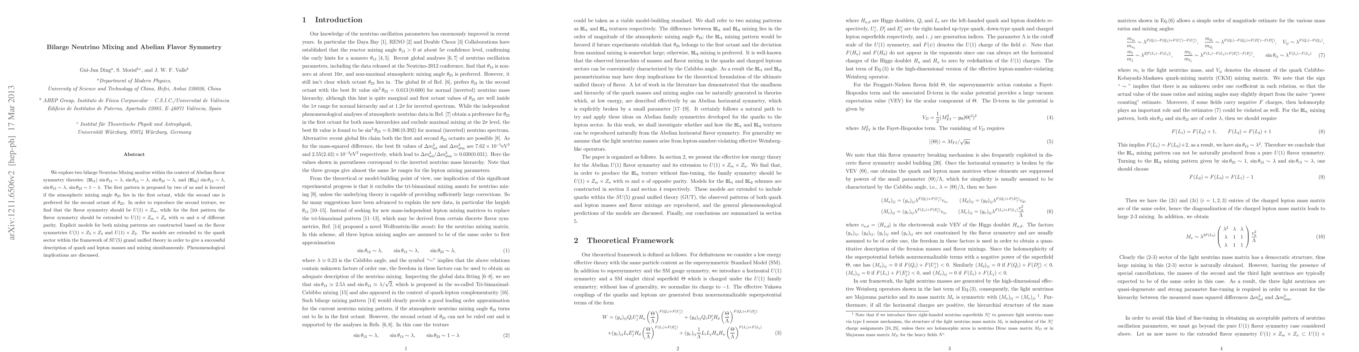 This paper investigates two bilarge neutrino mixing patterns under Abelian flavor symmetry theories, proposing explicit models based on $U(1)\times Z_m$ and $U(1)\times Z_m\times Z_n$ symmetries. It extends these models to the quark sector within SU(5) to describe unified quark and lepton masses and mixing, with implications for atmospheric neutrino mixing angles.