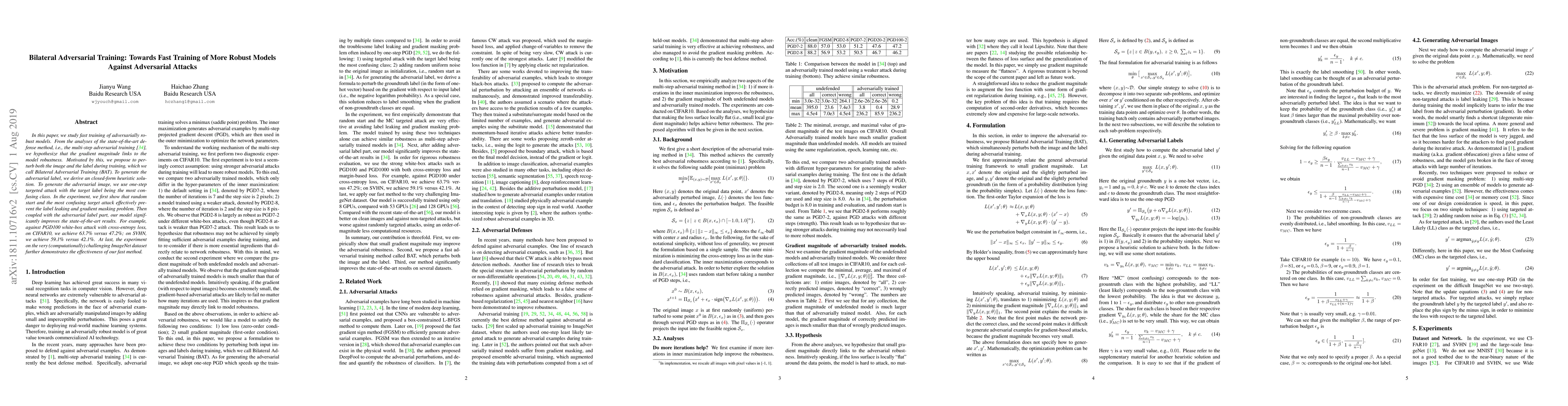 This paper proposes Bilateral Adversarial Training (BAT) to quickly develop robust models against adversarial attacks. BAT perturbs both the image and label during training, using a heuristic solution for adversarial labels and a targeted attack for images, which significantly improves adversarial defense performance on datasets like CIFAR10, SVHN, and ImageNet.