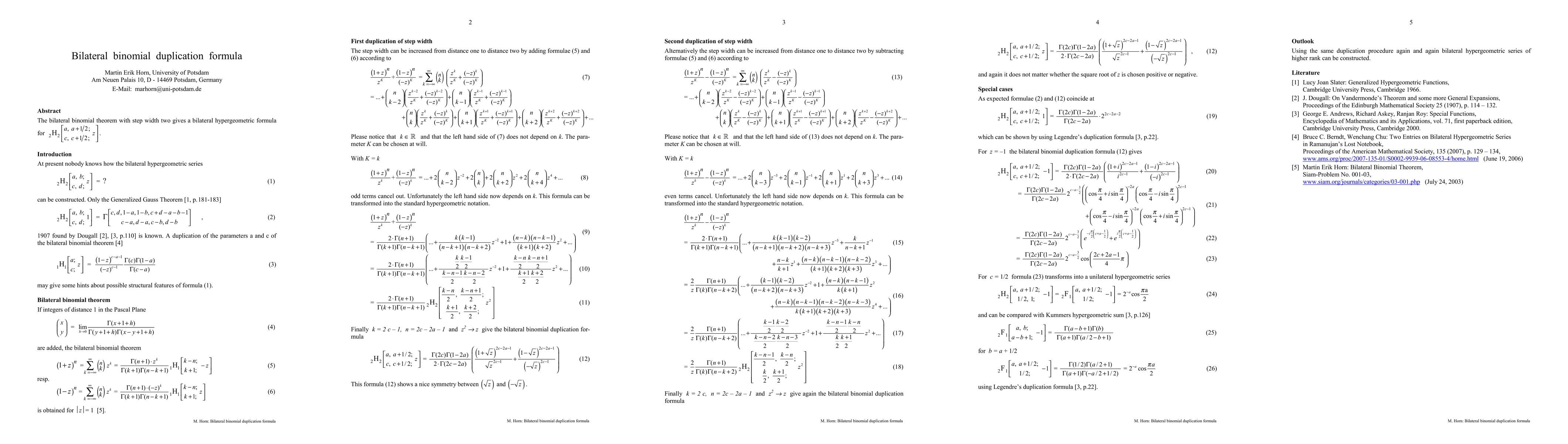 The bilateral binomial theorem with step width two gives a bilateral hypergeometric formula for 2H2(a, a+1/2; c, c+1/2; z).