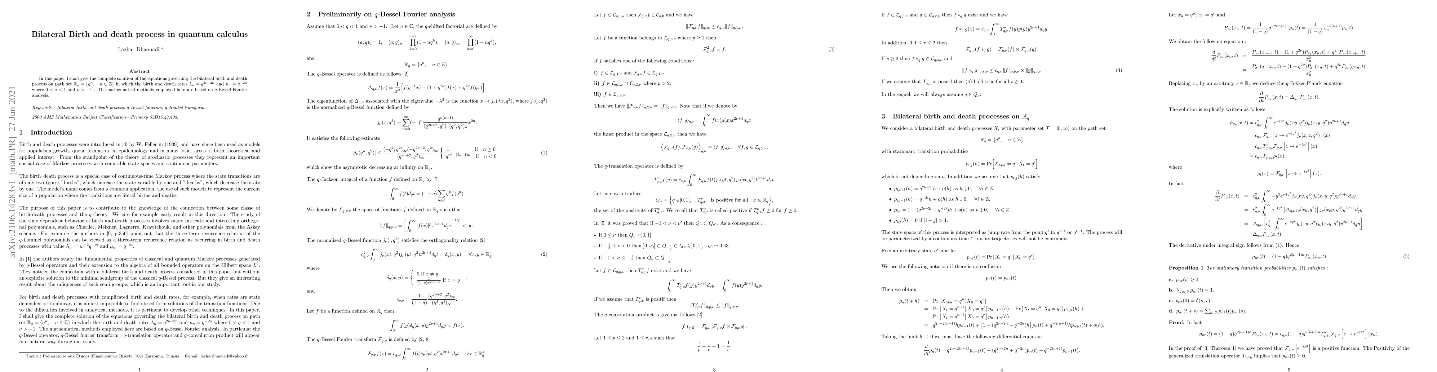 This paper provides a complete solution for the bilateral birth and death process on the path set $\mathbb{R}_q$ using $q$-Bessel Fourier analysis, with birth and death rates defined as $\lambda_n=q^{2\nu-2n}$ and $\mu_n=q^{-2n}$ respectively.
