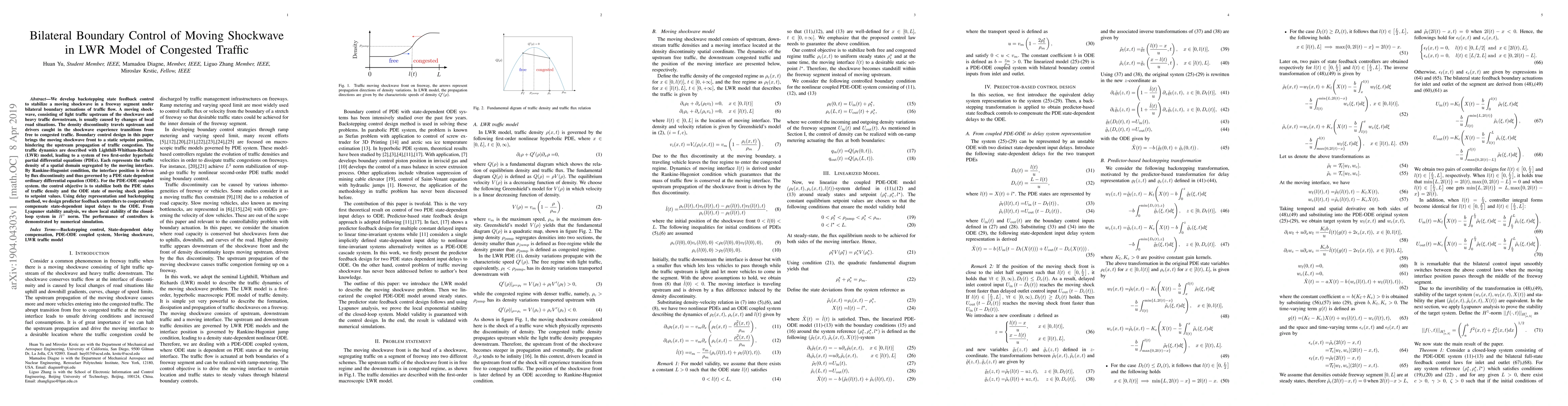 This research addresses boundary feedback control problem of moving shockwave in congested traffic described by PDE-ODE system. It provides a novel solution for stabilizing the coupledsystem to desired setpoint.