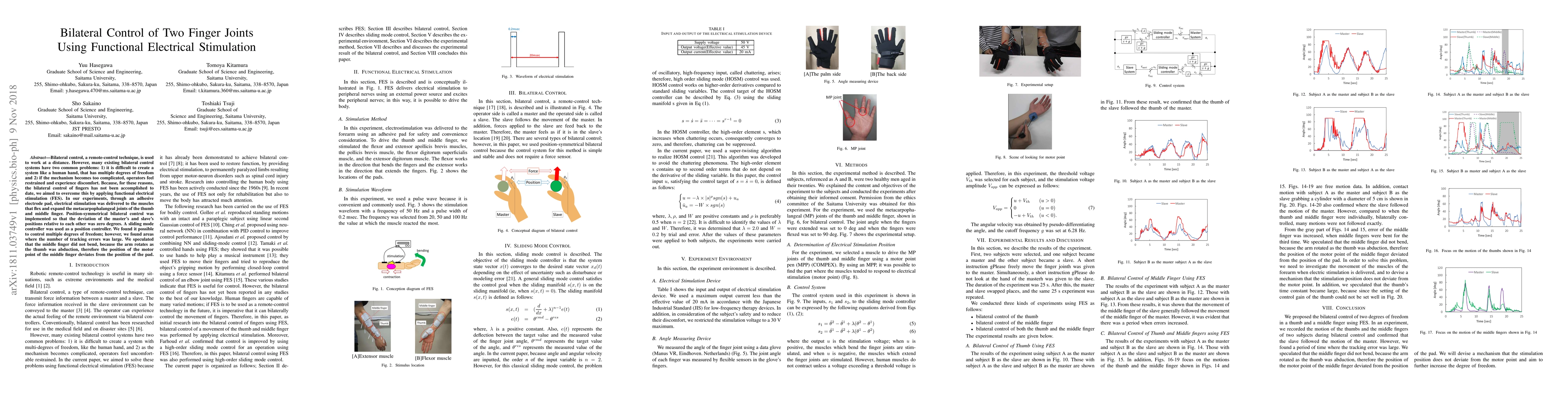 This paper explores bilateral control of thumb and middle finger joints using functional electrical stimulation (FES) to overcome the limitations of existing systems. Despite achieving position-symmetrical bilateral control, tracking errors were identified, particularly due to deviations in the motor point of the middle finger during thumb abduction.