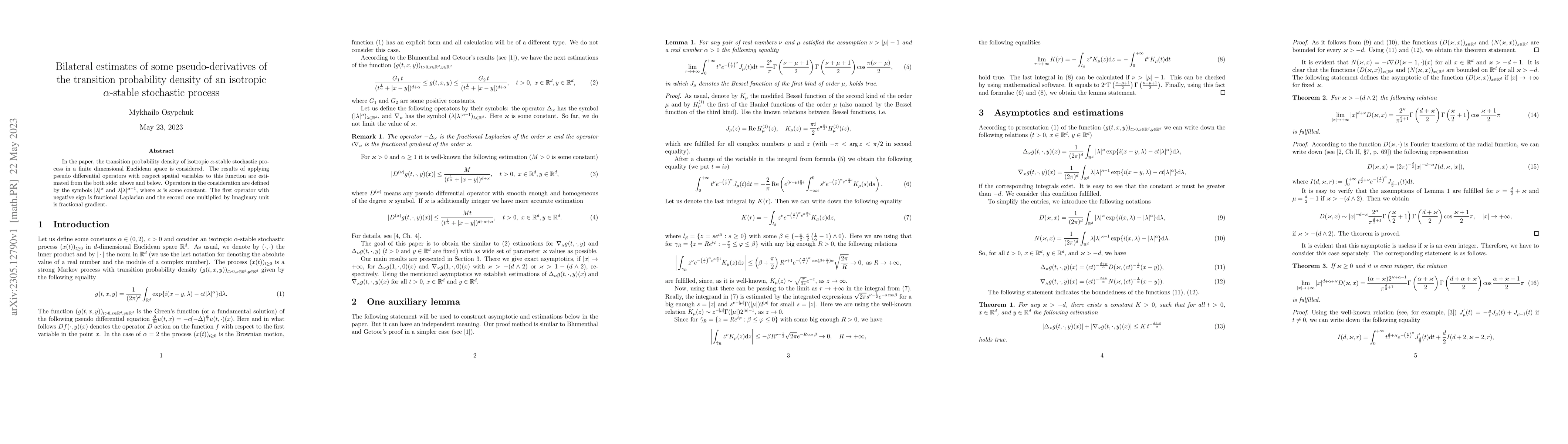 This paper estimates the transition probability density of an isotropic $\alpha$-stable stochastic process using pseudo differential operators, providing both upper and lower bounds for the results. The operators involve $|\lambda|^\varkappa$ and $\lambda|\lambda|^{\varkappa-1}$, with the former representing a fractional Laplacian and the latter, when multiplied by the imaginary unit, a fractional gradient.