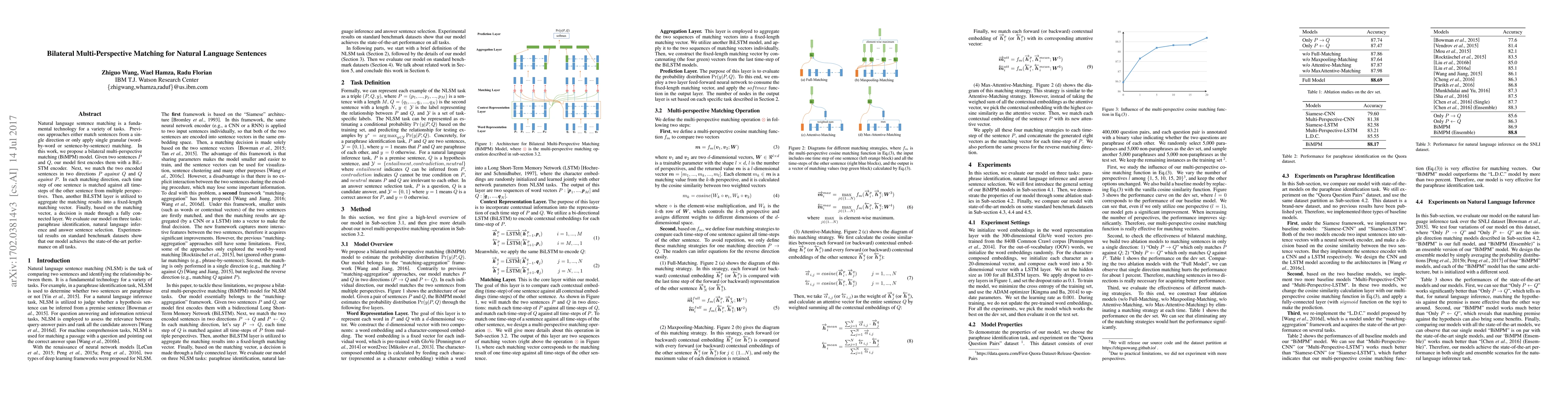 This paper proposes a bilateral multi-perspective matching (BiMPM) model for natural language sentence matching, which encodes sentences bidirectionally and matches them from multiple perspectives before aggregating the results. The model achieves state-of-the-art performance on paraphrase identification, natural language inference, and answer sentence selection tasks.