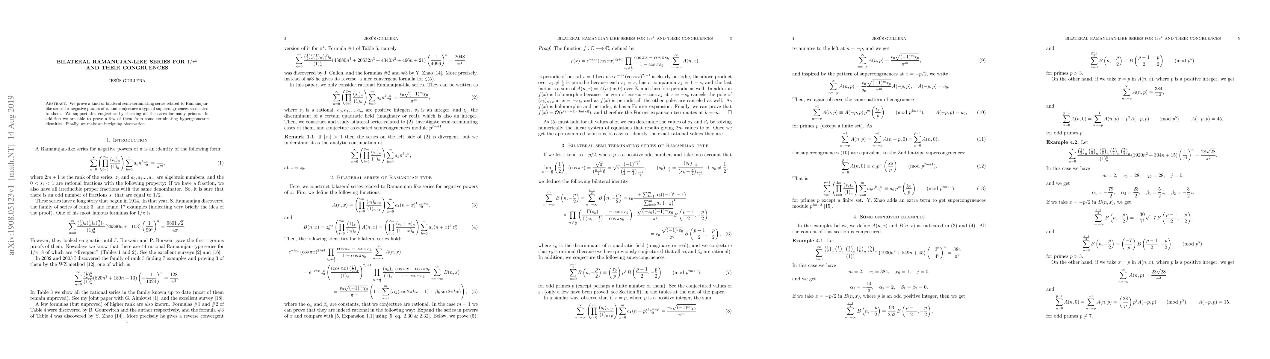 We prove a kind of bilateral semi-terminating series related to Ramanujan-like series for negative powers of $\pi$, and conjecture a type of supercongruences associated to them. We support this conjecture by checking all the cases for many primes. In addition we are able to prove a few of them from some terminating hypergeometric identities. Finally, we make an intriguing observation.