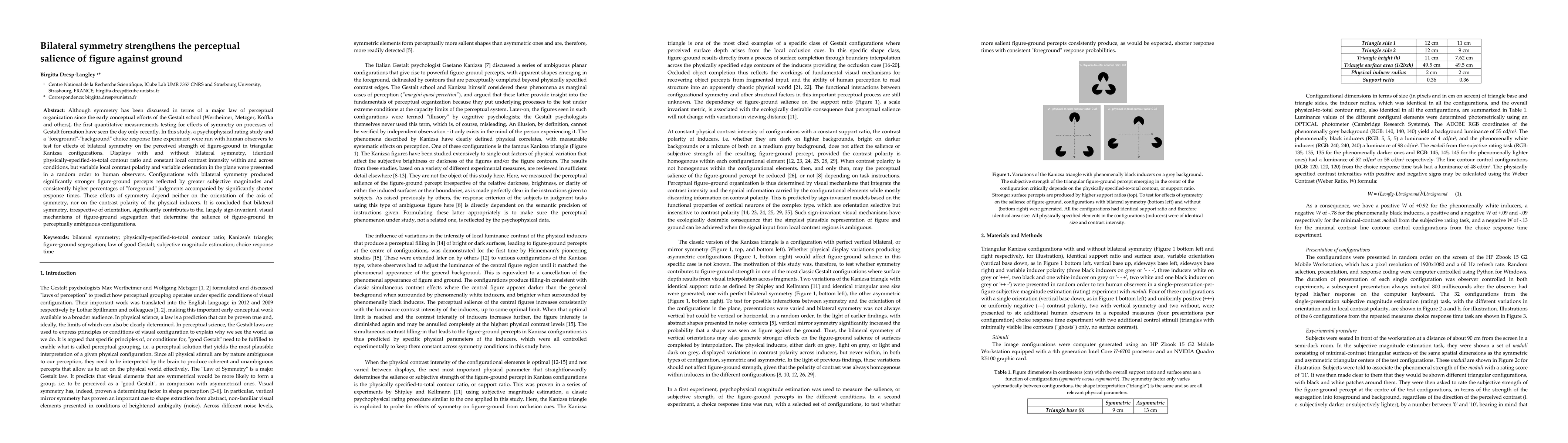 Although symmetry has been discussed in terms of a major law of perceptual organization since the early conceptual efforts of the Gestalt school (Wertheimer, Metzger, Koffka and others), the first quantitative measurements testing for effects of symmetry on processes of Gestalt formation have seen the day only recently. In this study, a psychophysical rating study and a "foreground" versus "background" choice response time experiment were run with human observers to test for effects of bilateral symmetry on the perceived strength of figure against ground in triangular Kanizsa configurations. Displays with and without bilateral symmetry, identical physically specified to total contour ratio and constant local contrast intensity within and across conditions, but variable local contrast polarity and variable orientation in the plane were presented in a random order to human observers. Configurations with bilateral symmetry produced significantly stronger figure against ground percepts reflected by greater subjective magnitudes and consistently higher percentages of "foreground" judgments accompanied by significantly shorter response times. These effects of symmetry depend neither on the orientation of the axis of symmetry, nor on the contrast polarity of the physical inducers. It is concluded that bilateral symmetry, irrespective of orientation, significantly contributes to the, largely sign invariant, visual mechanisms of shape segregation that determine the salience of figure against ground in perceptually ambiguous image configurations.