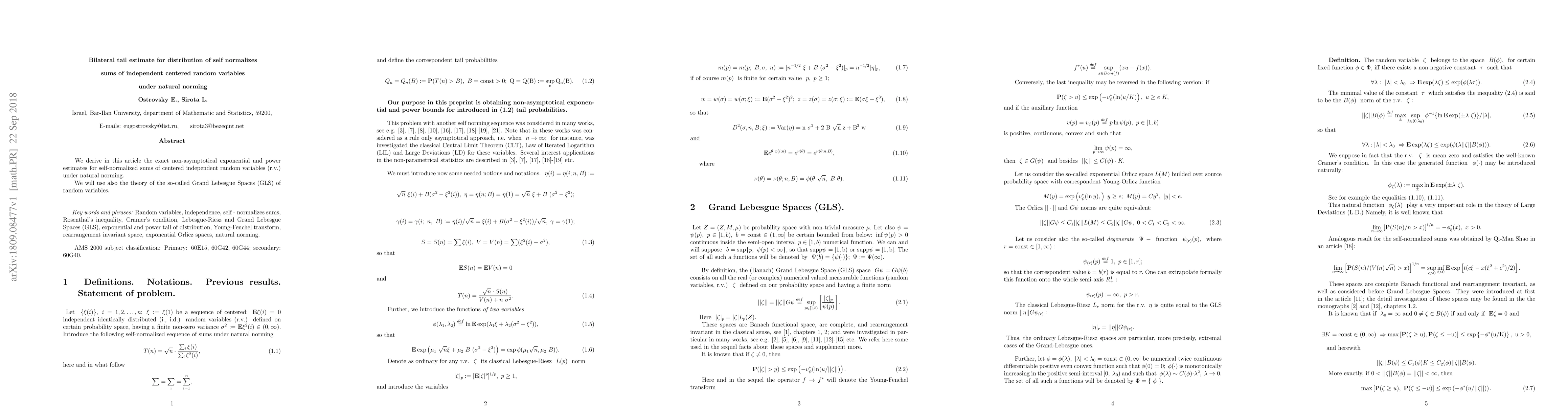 Summary: This paper provides exact non-asymptotic exponential and power estimates for self-normalized sums of centered independent random variables under natural norming, utilizing the theory of Grand Lebesgue Spaces (GLS) of random variables. The results offer precise bilateral tail estimates for the distribution of these sums.