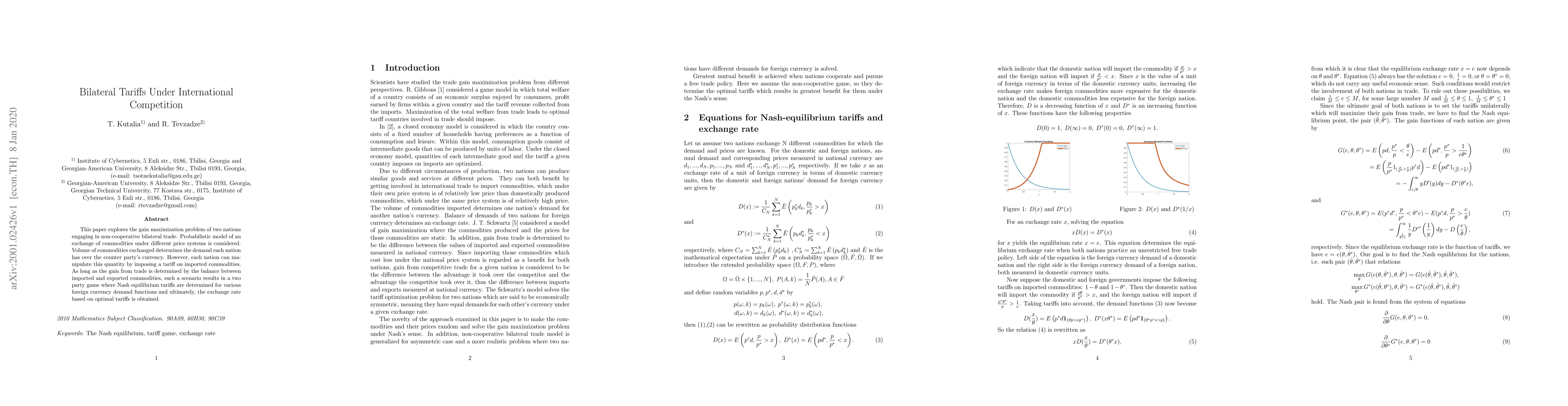 This paper explores the gain maximization problem of two nations engaging in non-cooperative bilateral trade. Probabilistic model of an exchange of commodities under different price systems is considered. Volume of commodities exchanged determines the demand each nation has over the counter party's currency. However, each nation can manipulate this quantity by imposing a tariff on imported commodities. As long as the gain from trade is determined by the balance between imported and exported commodities, such a scenario results in a two party game where Nash equilibrium tariffs are determined for various foreign currency demand functions and ultimately, the exchange rate based on optimal tariffs is obtained.