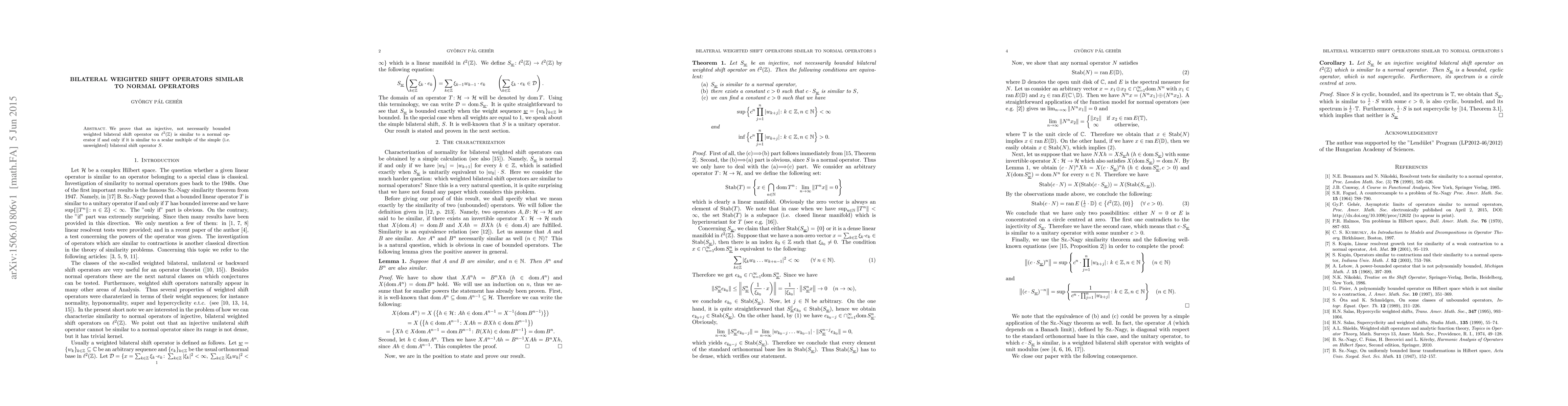 An injective weighted bilateral shift operator is similar to a normal operator if it is similar to a scalar multiple of the unweighted simple bilateral shift operator.