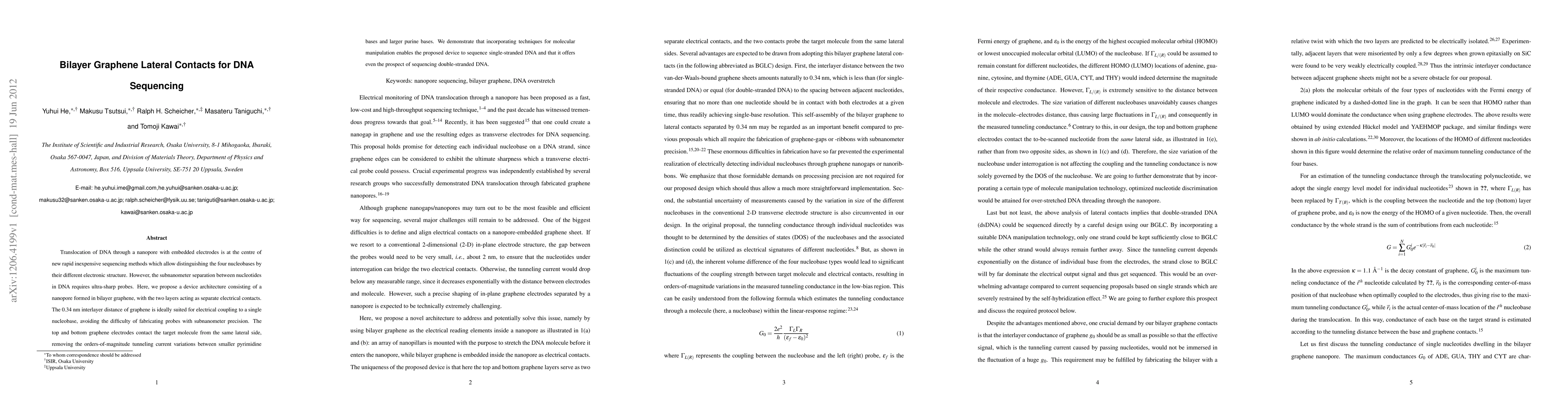 This paper proposes a novel DNA sequencing method using a nanopore in bilayer graphene with lateral contacts, leveraging the 0.34 nm interlayer distance for precise electrical coupling to nucleobases. The device aims to eliminate tunneling current variations and enable sequencing of both single- and potentially double-stranded DNA.
