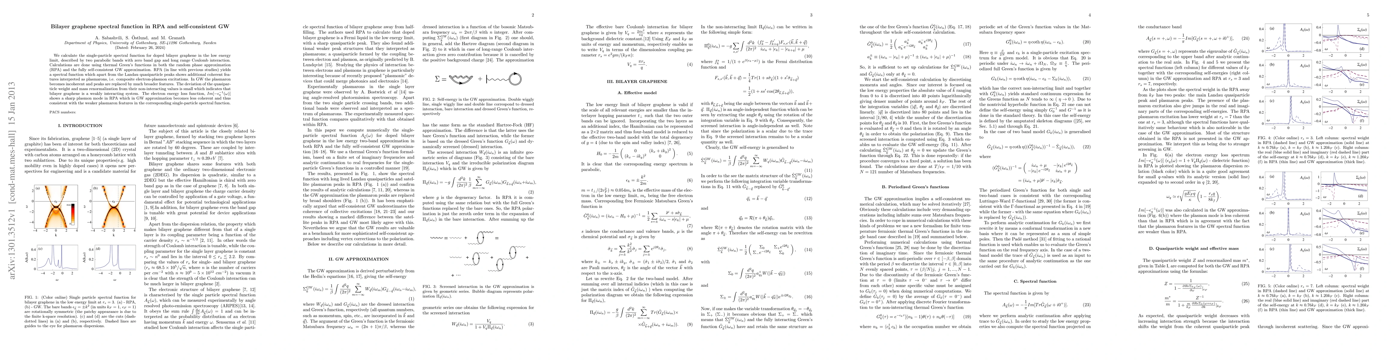 This paper investigates the single-particle spectral function of doped bilayer graphene using RPA and self-consistent GW methods, revealing plasmaron features in RPA and broader, incoherent peaks in GW, indicating weak electron interactions.