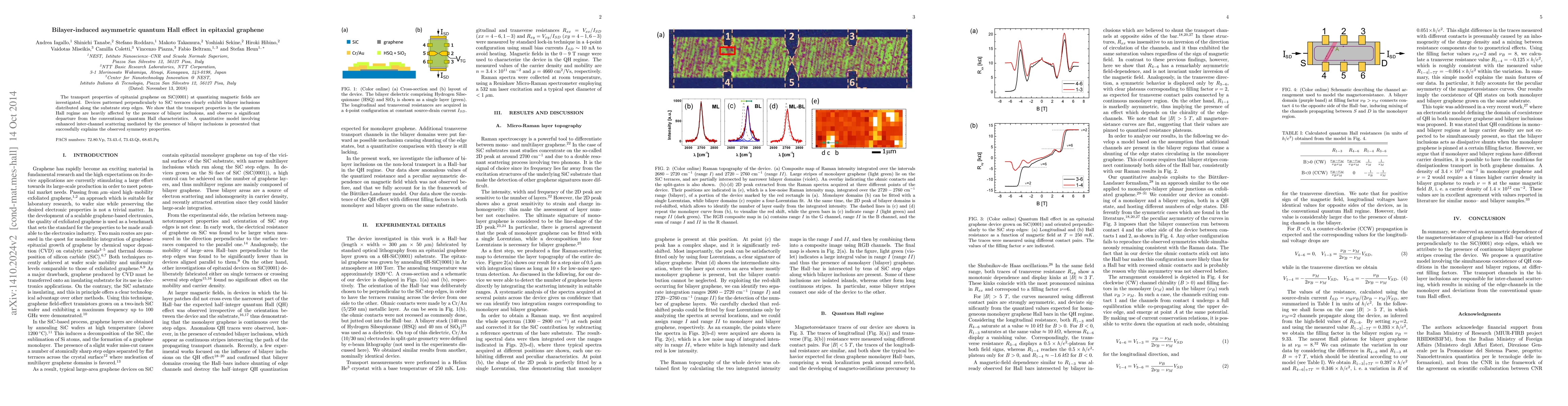 Epitaxial graphene on SiC exhibits an asymmetric quantum Hall effect due to bilayer inclusions along substrate step edges, deviating from conventional behavior and explained by enhanced inter-channel scattering. The findings highlight the impact of bilayer structures on quantum transport properties.