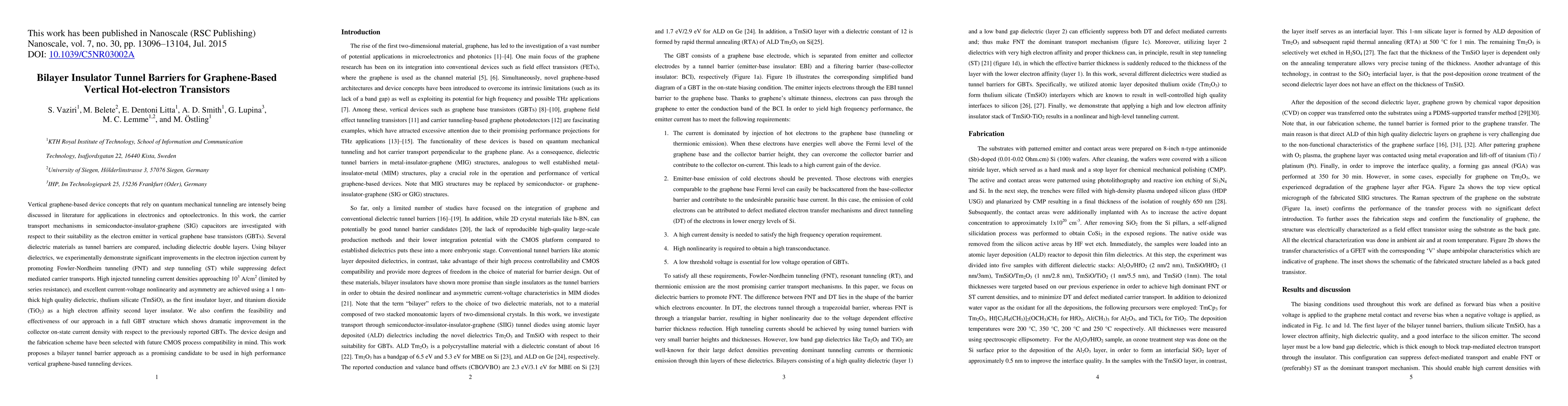 This research investigates bilayer insulator tunnel barriers in vertical graphene-based hot-electron transistors, demonstrating significant enhancements in electron injection currents through improved Fowler-Nordheim and step tunneling mechanisms, achieving high current densities and nonlinear characteristics, and confirming effectiveness in a full graphene base transistor structure.