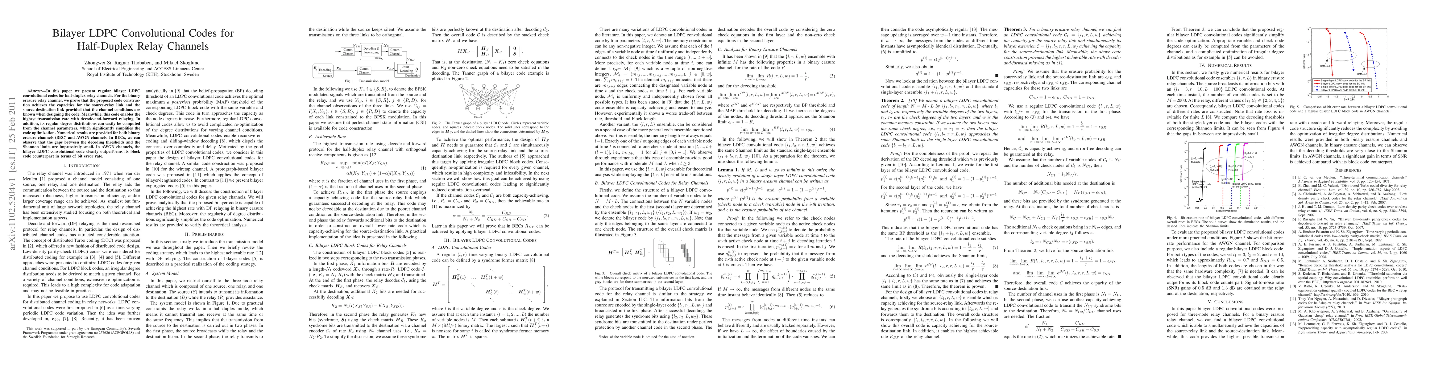 This paper introduces regular bilayer LDPC convolutional codes for half-duplex relay channels, proving capacity achievement for binary erasure relay channels when channel conditions are known. The proposed codes outperform block codes in terms of bit error rate on AWGN channels and show minimal gaps to Shannon limits in binary erasure channels.