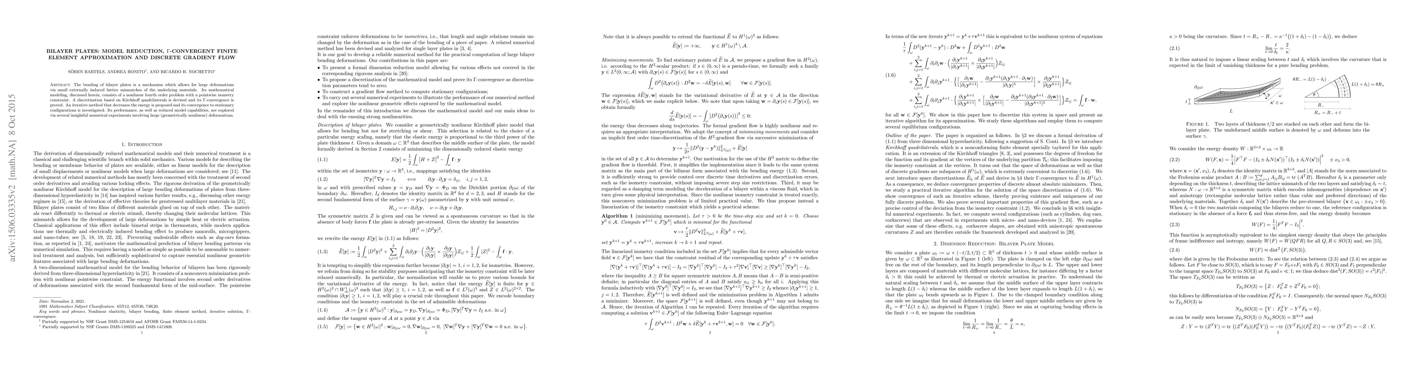 This paper models the bending of bilayer plates, focusing on a nonlinear fourth-order problem with an isometry constraint, and proposes a $\Gamma$-convergent finite element discretization. It investigates an iterative method for energy minimization and explores its performance through numerical experiments on large deformations.