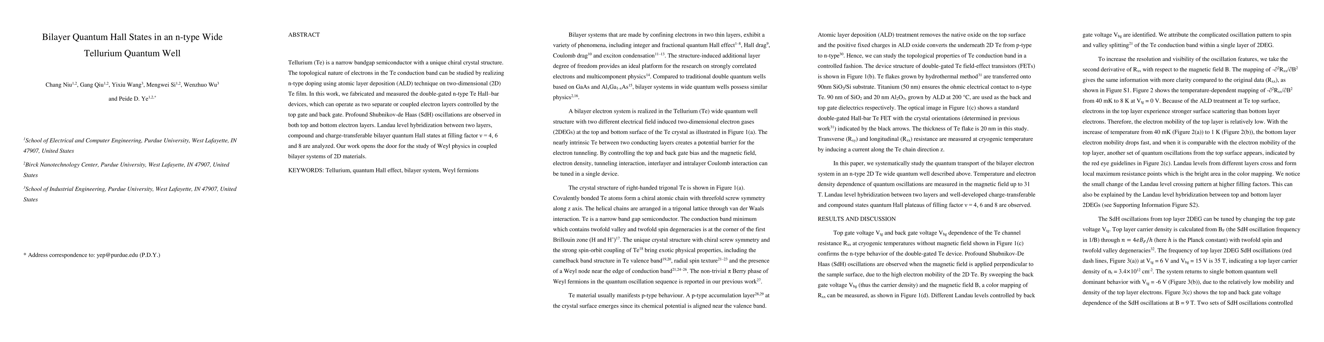 Tellurium (Te) is a narrow bandgap semiconductor with a unique chiral crystal structure. The topological nature of electrons in the Te conduction band can be studied by realizing n-type doping using atomic layer deposition (ALD) technique on two-dimensional (2D) Te film. In this work, we fabricated and measured the double-gated n-type Te Hall-bar devices, which can operate as two separate or coupled electron layers controlled by the top gate and back gate. Profound Shubnikov-de Haas (SdH) oscillations are observed in both top and bottom electron layers. Landau level hybridization between two layers, compound and charge-transferable bilayer quantum Hall states at filling factor 4, 6, and 8 are analyzed. Our work opens the door for the study of Weyl physics in coupled bilayer systems of 2D materials.