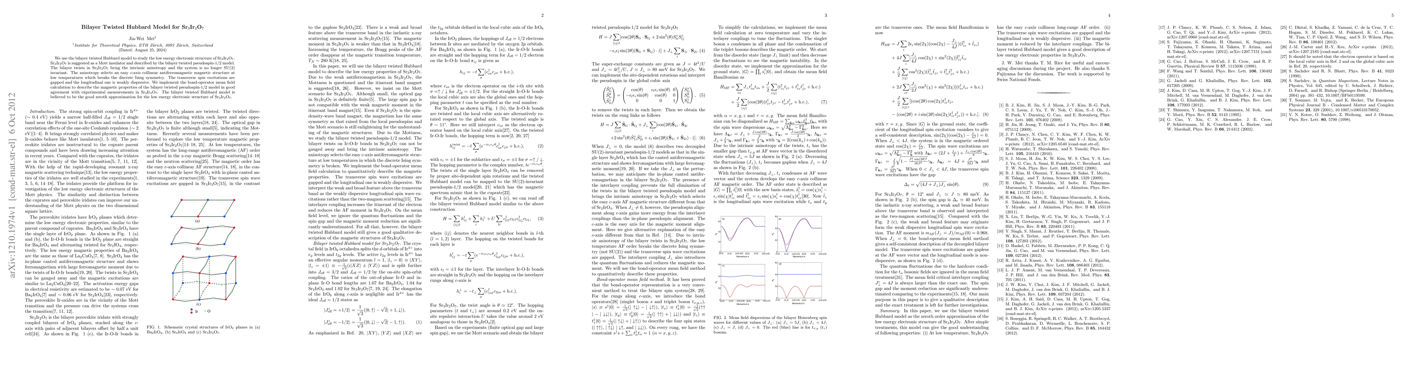 We use the bilayer twisted Hubbard model to study the low energy electronic structure of Sr3Ir2O7. Sr3Ir2O7 is suggested as a Mott insulator and described by the bilayer twisted pseudospin-1/2 model. The bilayer twists in Sr3Ir2O7 bring the intrinsic anisotropy and the system is no longer SU(2) invariant. The anisotropy selects an easy c-axis collinear antiferromagnetic magnetic structure at low temperatures which breaks the discrete Ising symmetry. The transverse spin excitations are gapped and the longitudinal one is weakly dispersive. We implement the bond-operator mean field calculation to describe the magnetic properties of the bilayer twisted pseudospin-1/2 model in good agreement with experimental measurements in Sr3Ir2O7. The bilayer twisted Hubbard model is believed to be the good zeroth approximation for the low energy electronic structure of Sr3Ir2O7.