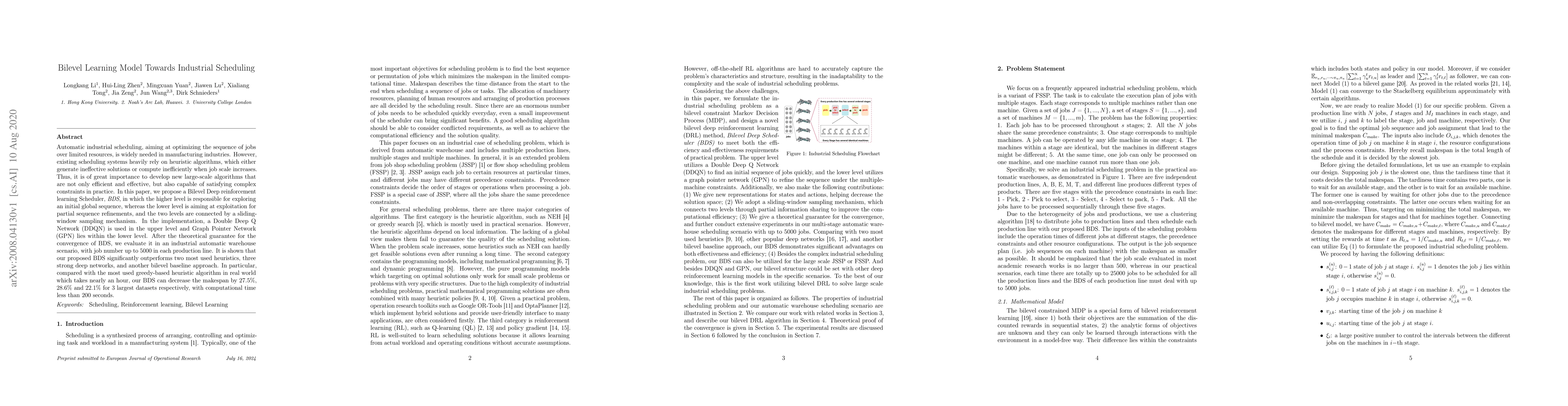 Automatic industrial scheduling, aiming at optimizing the sequence of jobs over limited resources, is widely needed in manufacturing industries. However, existing scheduling systems heavily rely on heuristic algorithms, which either generate ineffective solutions or compute inefficiently when job scale increases. Thus, it is of great importance to develop new large-scale algorithms that are not only efficient and effective, but also capable of satisfying complex constraints in practice. In this paper, we propose a Bilevel Deep reinforcement learning Scheduler, \textit{BDS}, in which the higher level is responsible for exploring an initial global sequence, whereas the lower level is aiming at exploitation for partial sequence refinements, and the two levels are connected by a sliding-window sampling mechanism. In the implementation, a Double Deep Q Network (DDQN) is used in the upper level and Graph Pointer Network (GPN) lies within the lower level. After the theoretical guarantee for the convergence of BDS, we evaluate it in an industrial automatic warehouse scenario, with job number up to $5000$ in each production line. It is shown that our proposed BDS significantly outperforms two most used heuristics, three strong deep networks, and another bilevel baseline approach. In particular, compared with the most used greedy-based heuristic algorithm in real world which takes nearly an hour, our BDS can decrease the makespan by 27.5\%, 28.6\% and 22.1\% for 3 largest datasets respectively, with computational time less than 200 seconds.