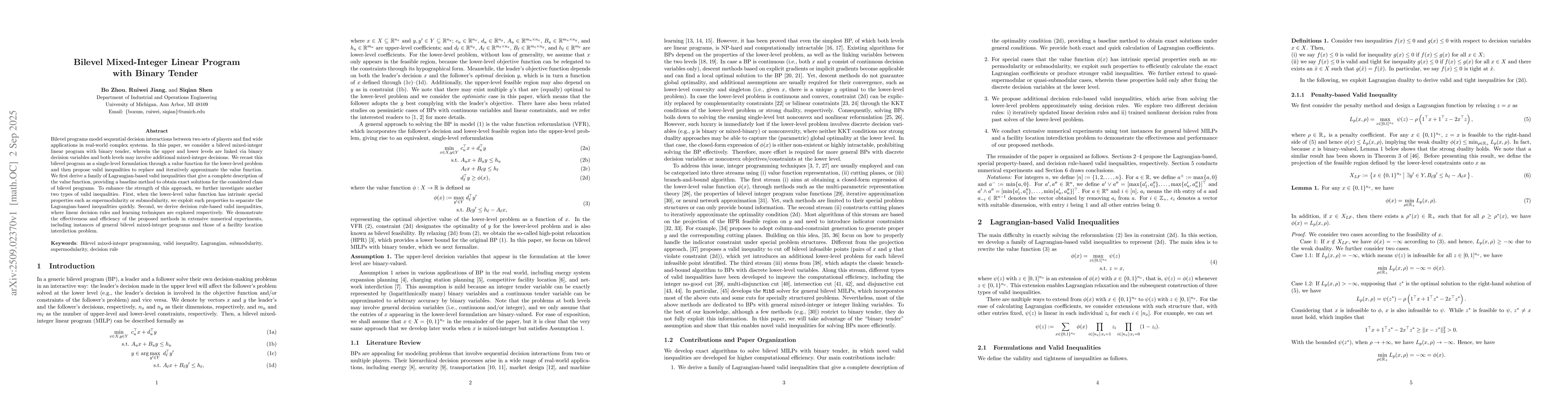 Bilevel programs model sequential decision interactions between two sets of players and find wide applications in real-world complex systems. In this paper, we consider a bilevel mixed-integer linear program with binary tender, wherein the upper and lower levels are linked via binary decision variables and both levels may involve additional mixed-integer decisions. We recast this bilevel program as a single-level formulation through a value function for the lower-level problem and then propose valid inequalities to replace and iteratively approximate the value function. We first derive a family of Lagrangian-based valid inequalities that give a complete description of the value function, providing a baseline method to obtain exact solutions for the considered class of bilevel programs. To enhance the strength of this approach, we further investigate another two types of valid inequalities. First, when the lower-level value function has intrinsic special properties such as supermodularity or submodularity, we exploit such properties to separate the Lagrangian-based inequalities quickly. Second, we derive decision rule-based valid inequalities, where linear decision rules and learning techniques are explored respectively. We demonstrate the effectiveness and efficiency of the proposed methods in extensive numerical experiments, including instances of general bilevel mixed-integer programs and those of a facility location interdiction problem.