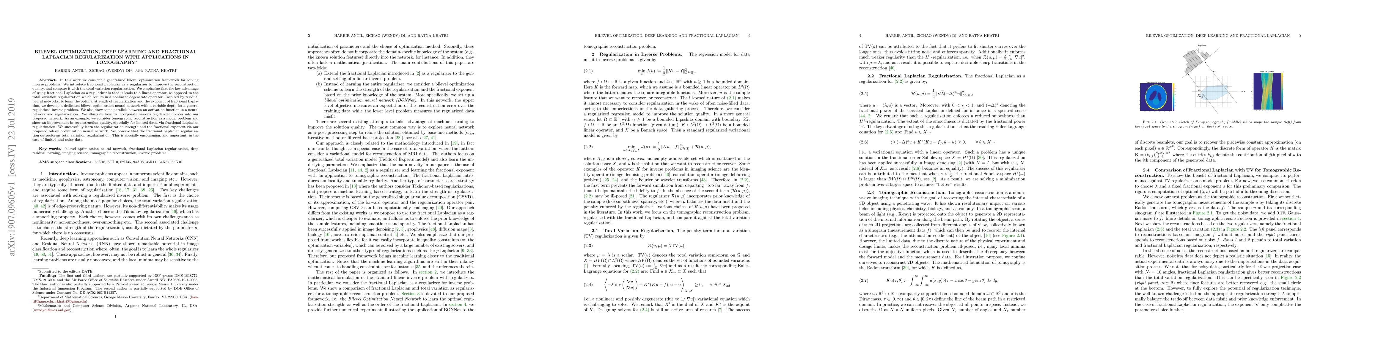 In this work we consider a generalized bilevel optimization framework for solving inverse problems. We introduce fractional Laplacian as a regularizer to improve the reconstruction quality, and compare it with the total variation regularization. We emphasize that the key advantage of using fractional Laplacian as a regularizer is that it leads to a linear operator, as opposed to the total variation regularization which results in a nonlinear degenerate operator. Inspired by residual neural networks, to learn the optimal strength of regularization and the exponent of fractional Laplacian, we develop a dedicated bilevel optimization neural network with a variable depth for a general regularized inverse problem. We also draw some parallels between an activation function in a neural network and regularization. We illustrate how to incorporate various regularizer choices into our proposed network. As an example, we consider tomographic reconstruction as a model problem and show an improvement in reconstruction quality, especially for limited data, via fractional Laplacian regularization. We successfully learn the regularization strength and the fractional exponent via our proposed bilevel optimization neural network. We observe that the fractional Laplacian regularization outperforms total variation regularization. This is specially encouraging, and important, in the case of limited and noisy data.