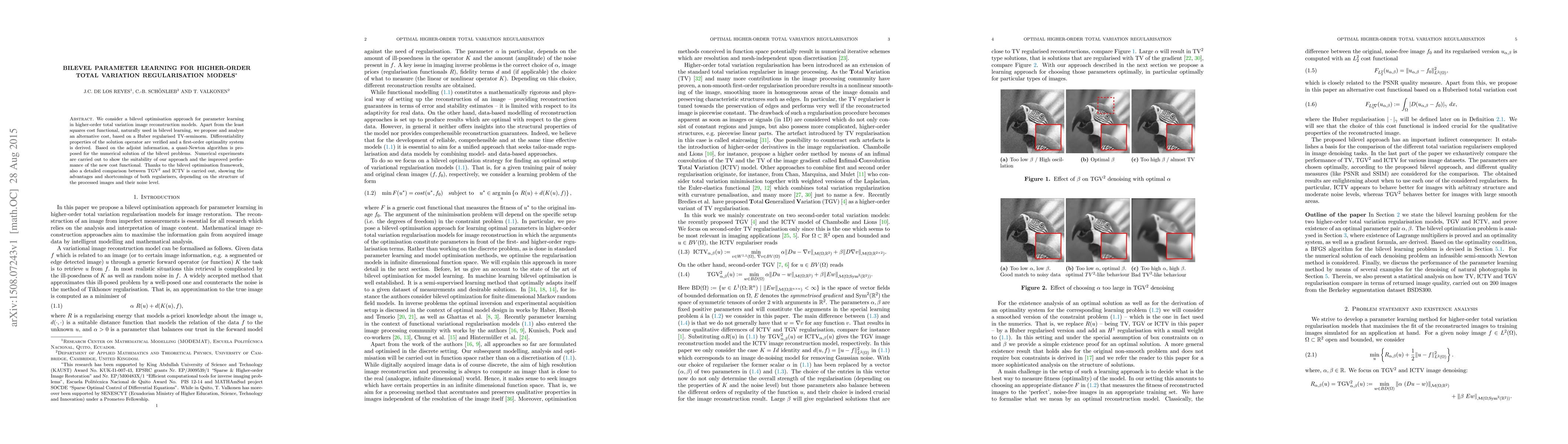 This paper proposes a bilevel optimisation method for parameter learning in higher-order total variation image reconstruction models, introducing a Huber regularised TV-seminorm cost functional. A quasi-Newton algorithm is developed for solving the bilevel problems, and numerical experiments demonstrate improved performance and a detailed comparison between TGV$^2$ and ICTV regularisers.
